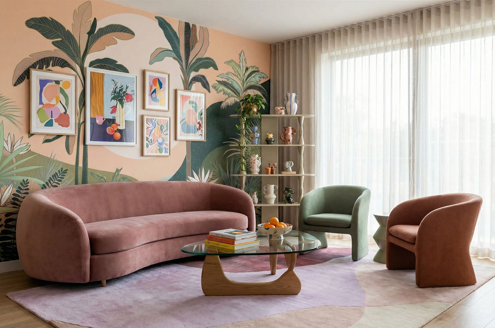 Цвет как эмоция. Истинный дофаминовый интерьер строится на глубоких, сочных, но благородных цветах: терракотовый, напоминающий о закате; сложный мятный, как морская волна; насыщенный горчичный, ассоциирующийся с теплом и специями; леденцово-розовый, как карамель на палочке из детства. Мы понимаем как важно подобрать тот самый оттенок, поэтому корректируем палитру любого сюжета до тех пор, пока обои не будут идеально отражать желаемое настроение.