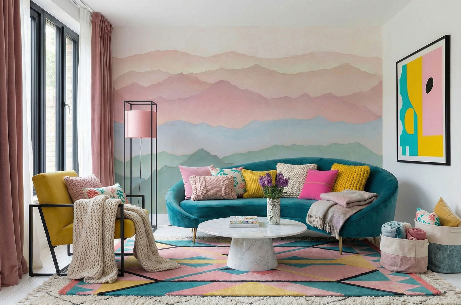 Игра с формами. Поддержите обои в дофаминовом стиле мебелью, текстилем и светильниками в оригинальных формах. Это создаёт многослойность и интерес.