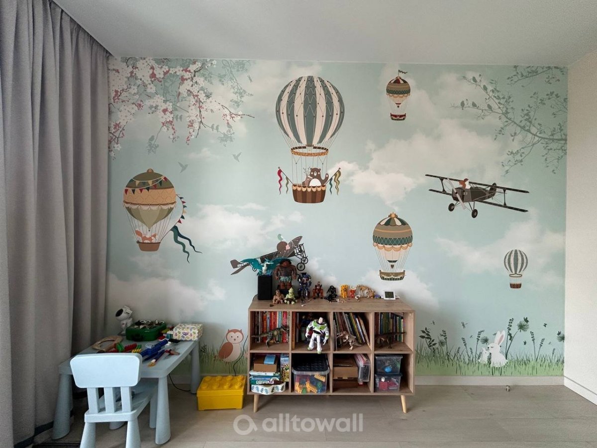 Воздушные мечты – элегантные обои для комнаты ребёнка. Такие покрытия подходят для детской девочки младшего возраста, которая увлекается сказками и других странах, путешествиями. Сюжет посвящён природному пейзажу с цветущими деревьями. Под ветвями видны густые травы, среди которых видны ёжики и совы, игривые зайчики и другие жители полей и лесов. В весеннем небе видны летающие воздушные шары, корзины которых украшены развевающимися флагами и лентами. В корзинах сидят медвежата, лисички и другие зверята-путешественники. Среди воздушных шаров летают старинные бипланы.