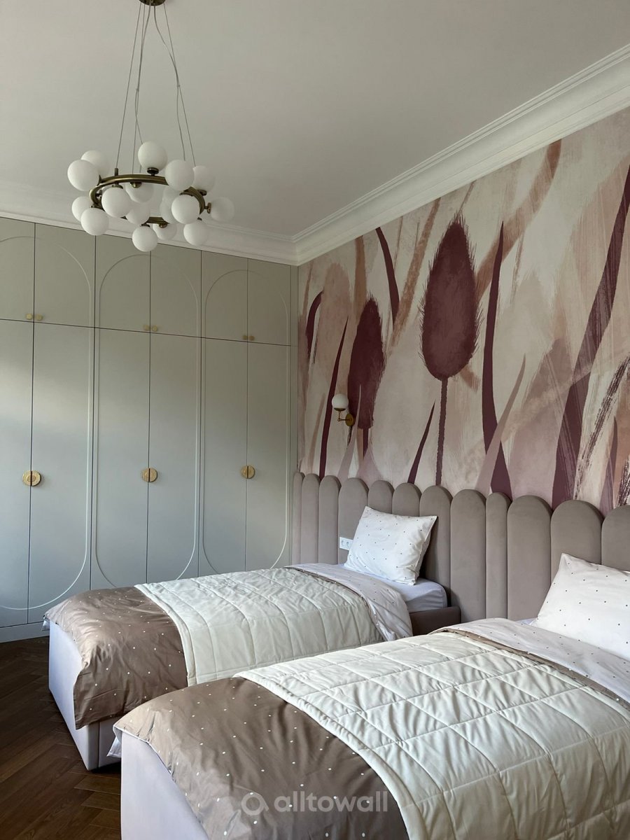 Бархатный луг-2 – это красивые обои с нежным рисунком, посвящённым растениям. Такой сюжет в нежно-розовых оттенках подходит для изысканной обстановки спальни, стильной гостиной или детской комнаты.