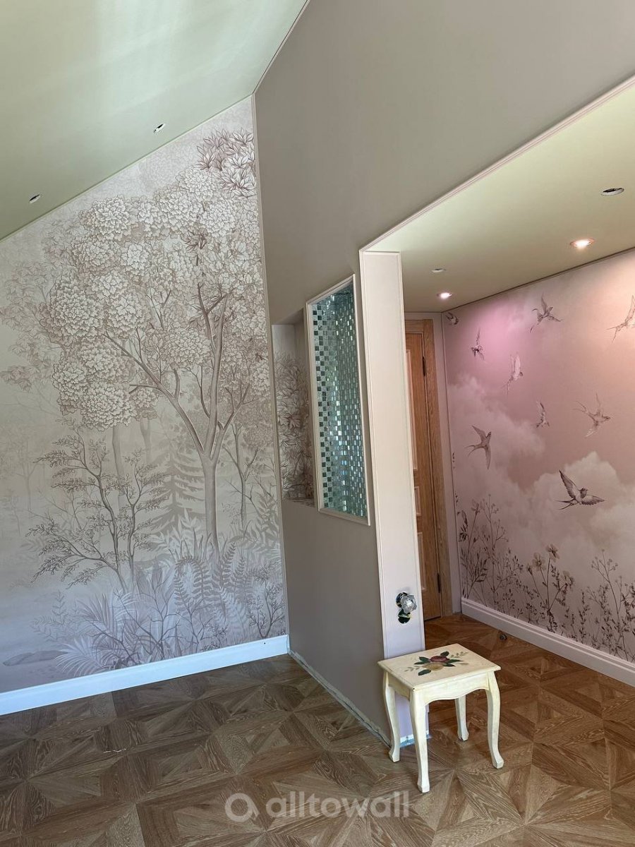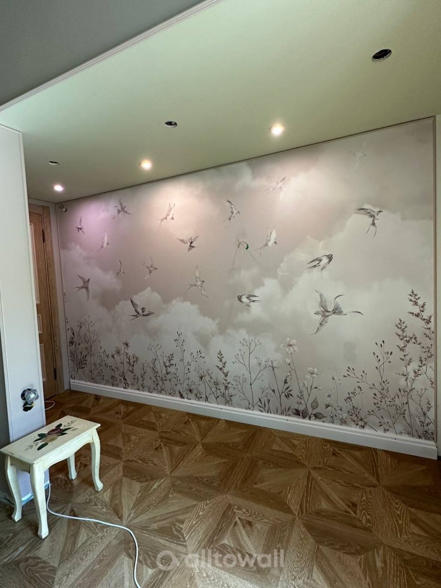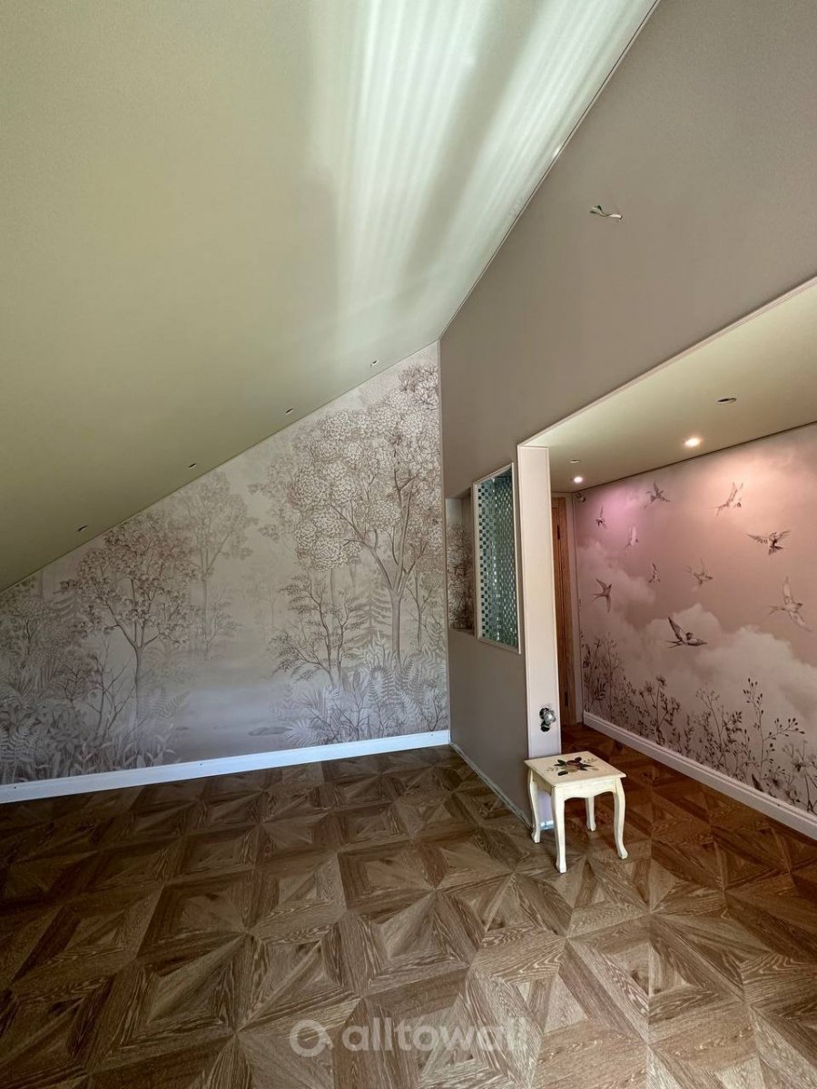 Особенности принта позволяют использовать его для фонового декора. При правильно подобранной обстановке можно создать гармоничную атмосферу, которая идеально подходит для детей младшего и среднего возраста, спален родителей или уютной общей комнаты. Тонкие линии и слегка расплывчатые переходы оттенков делают изображение ненавязчивым и привлекательным. Несмотря на кажущуюся насыщенность деталями, принт нежный, подходящий для оклеивания стен.