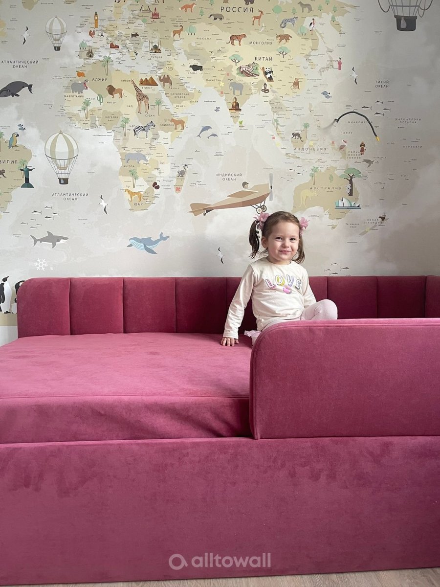 Малыш совсем недавно начал жить — и он даже не представляет, насколько огромен и разнообразен этот мир. Расширить его кругозор, сделать первые шаги в изучении географии поможет супер детальная карта мира, которая будет прямо на стене его комнаты. Детские обои «Карта мира» выполнены в пастельных тонах, они визуально расширяют пространство, создают благоприятный эмоциональный фон для усвоения новой информации и общения с родителями.