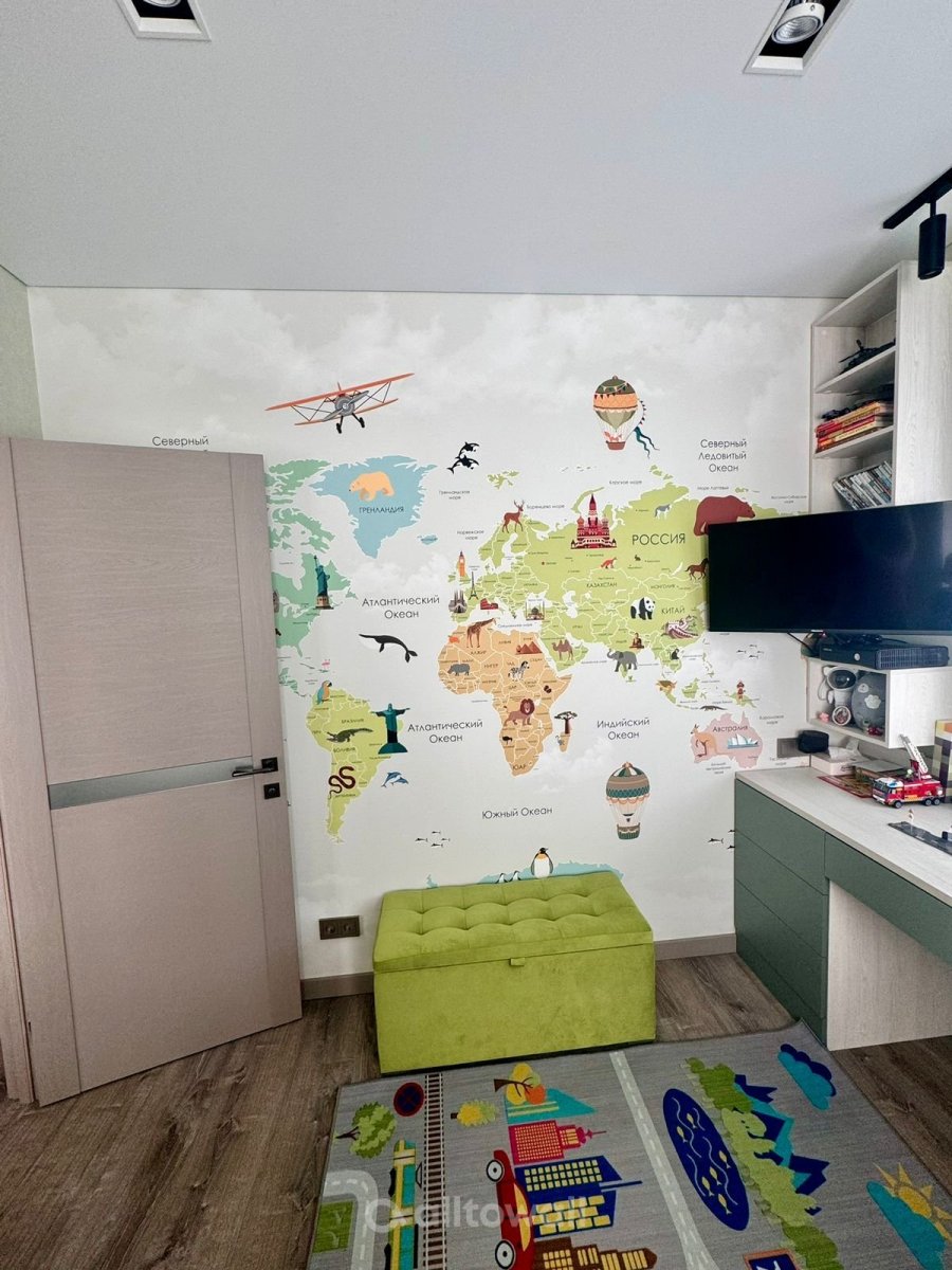 Обои "Детская карта мира с достопримечательностями и животными-2" в интерьерах наших клиентов