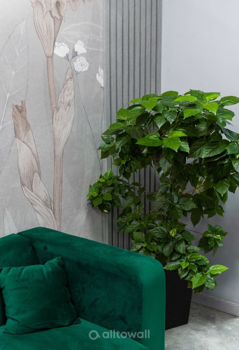 Такие обои лучше подходят для спален и гостиных, комнат с нехваткой естественного освещения или ярким солнечным светом. Серые оттенки со светлыми акцентами в виде бутонов сразу привлекают внимание изысканностью и элегантностью бутонов. Покрытия можно использовать в качестве общего фона или в виде лаконичной акцентной стены, задавая необходимое настроение. Обои подходят для классических и современных стилей.