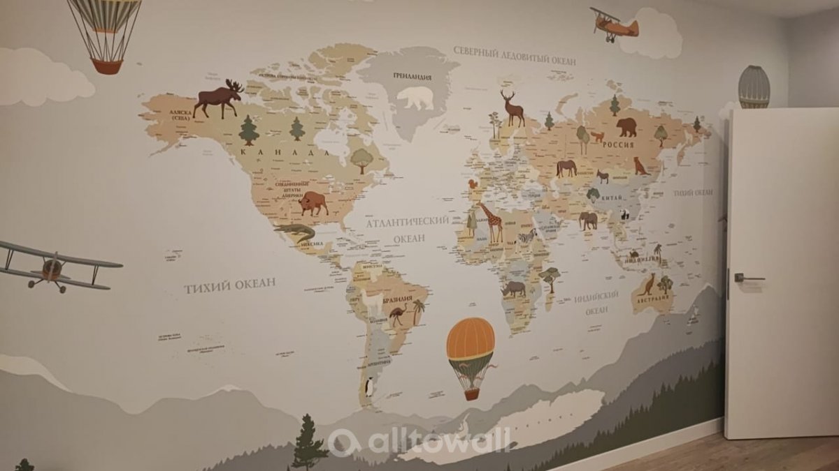 Основная тема – карта мира с указанием контуров и наименований других стран. Рисунок на бледно-голубом фоне дополнен изображениями гор, растений и животных. Больше привлекательности сюжету придают яркие воздушные шары и бипланы, парящие над континентами и океанами. Нижняя часть карты декорирована принтом в виде величественных гор с наснеженными вершинами, что зрительно увеличивает высоту потолка и расширяет окружающее пространство.