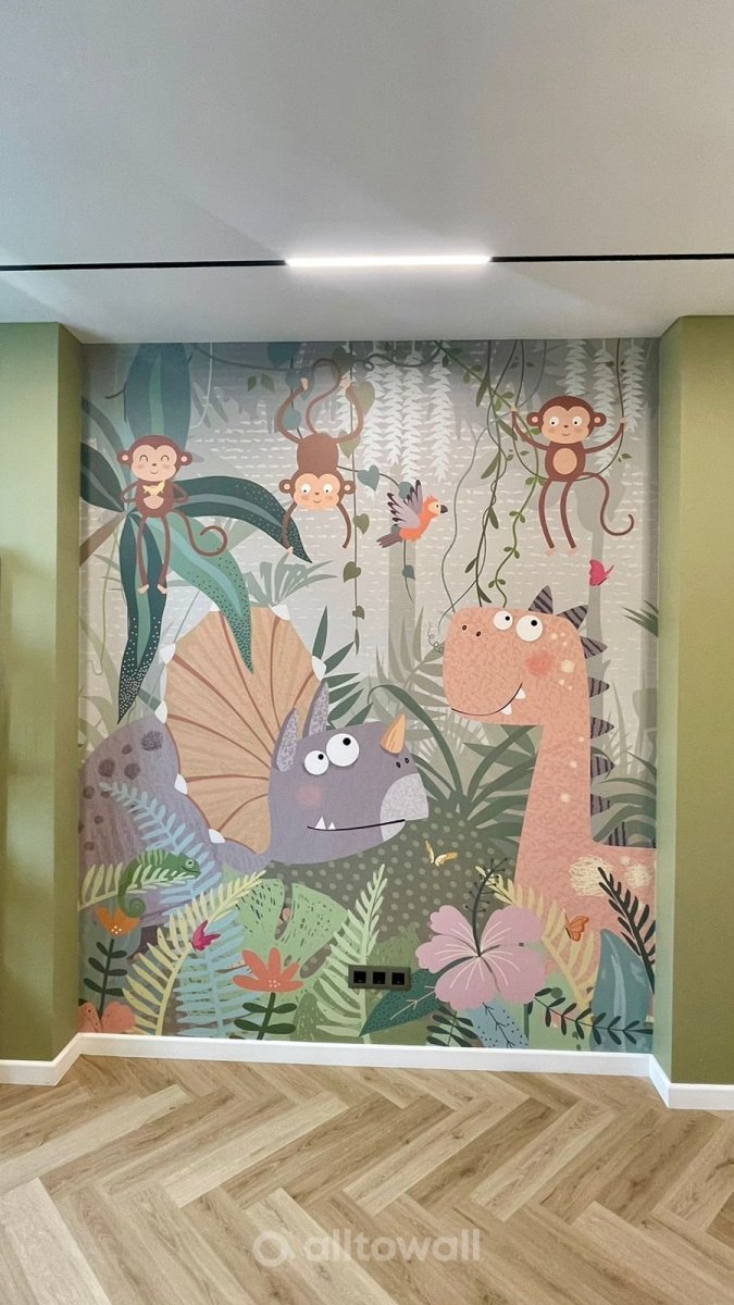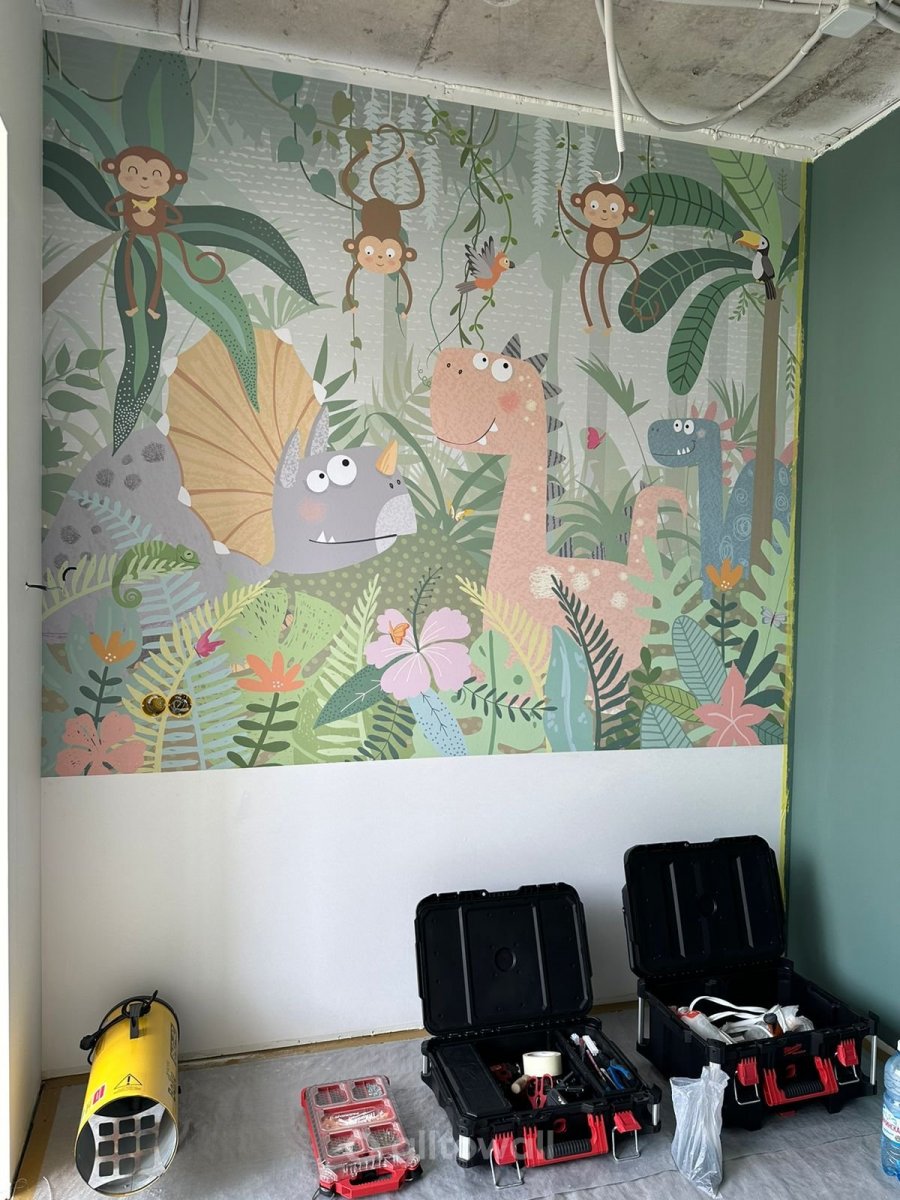 Для обоев выбрана спокойная цветовая гамма – белый, оттенки зелёного и жёлтого, бежевый, розовый, голубой цвета. Особенности принта в стиле детского рисунка позволяют создать уютный доисторический мирок. Варианты оформления пространства: