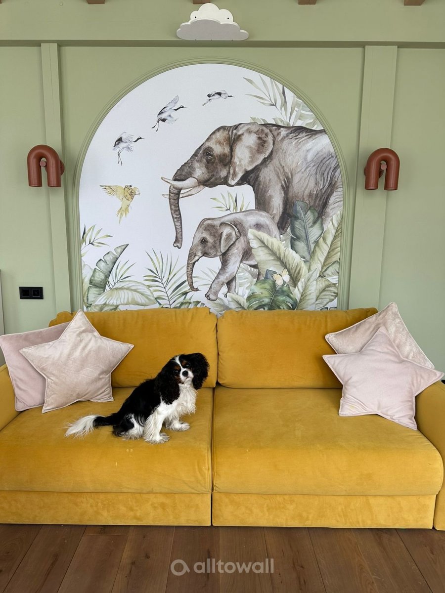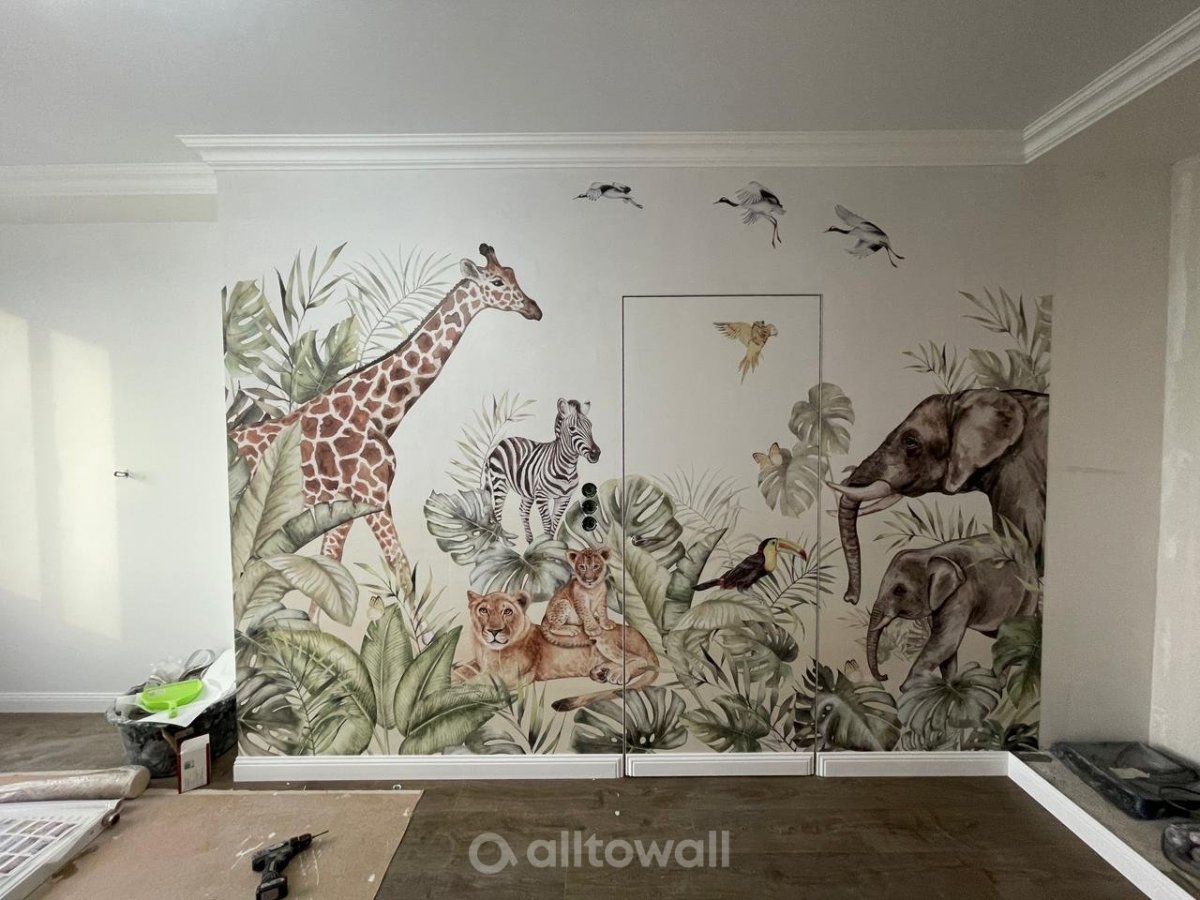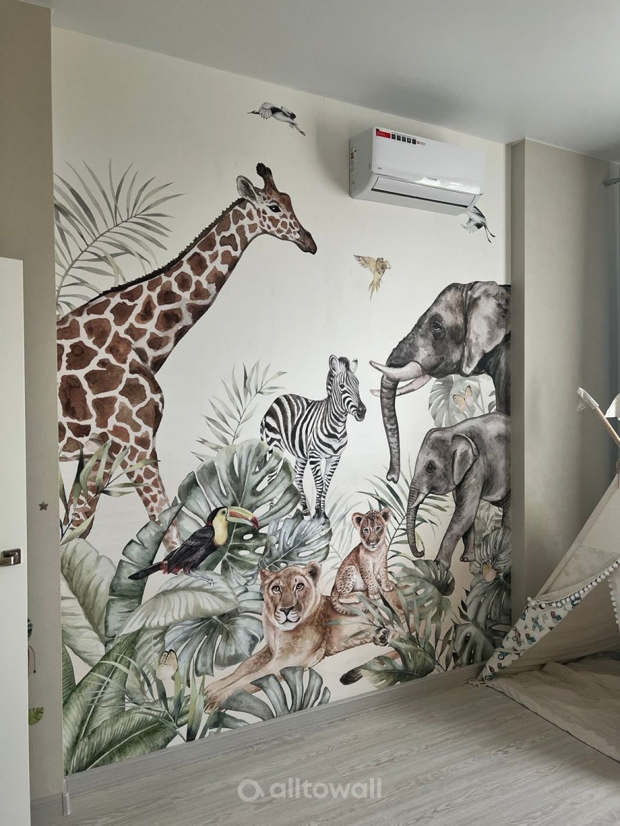 Яркие и насыщенные обои с тропическими растениями и животными превратят стену в уголок дикой природы. Отличный выбор для детской или игровой зоны. Любые сюжеты из каталога можно адаптировать под нужный вам размер стены, а также сделать более светлый или тёмный фон, чтобы полотно идеально вписалось в интерьер.