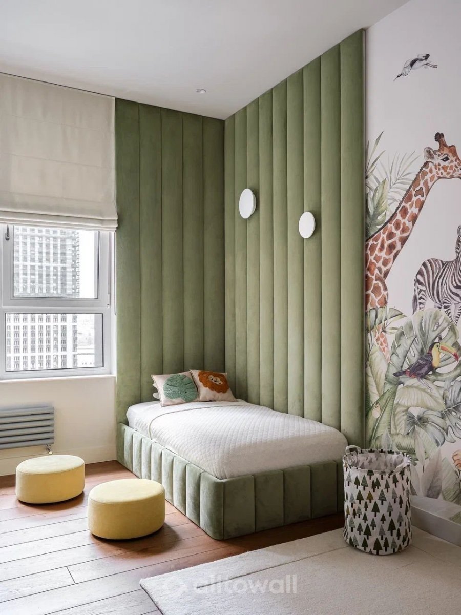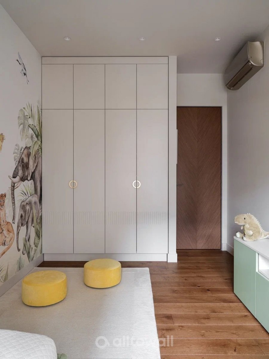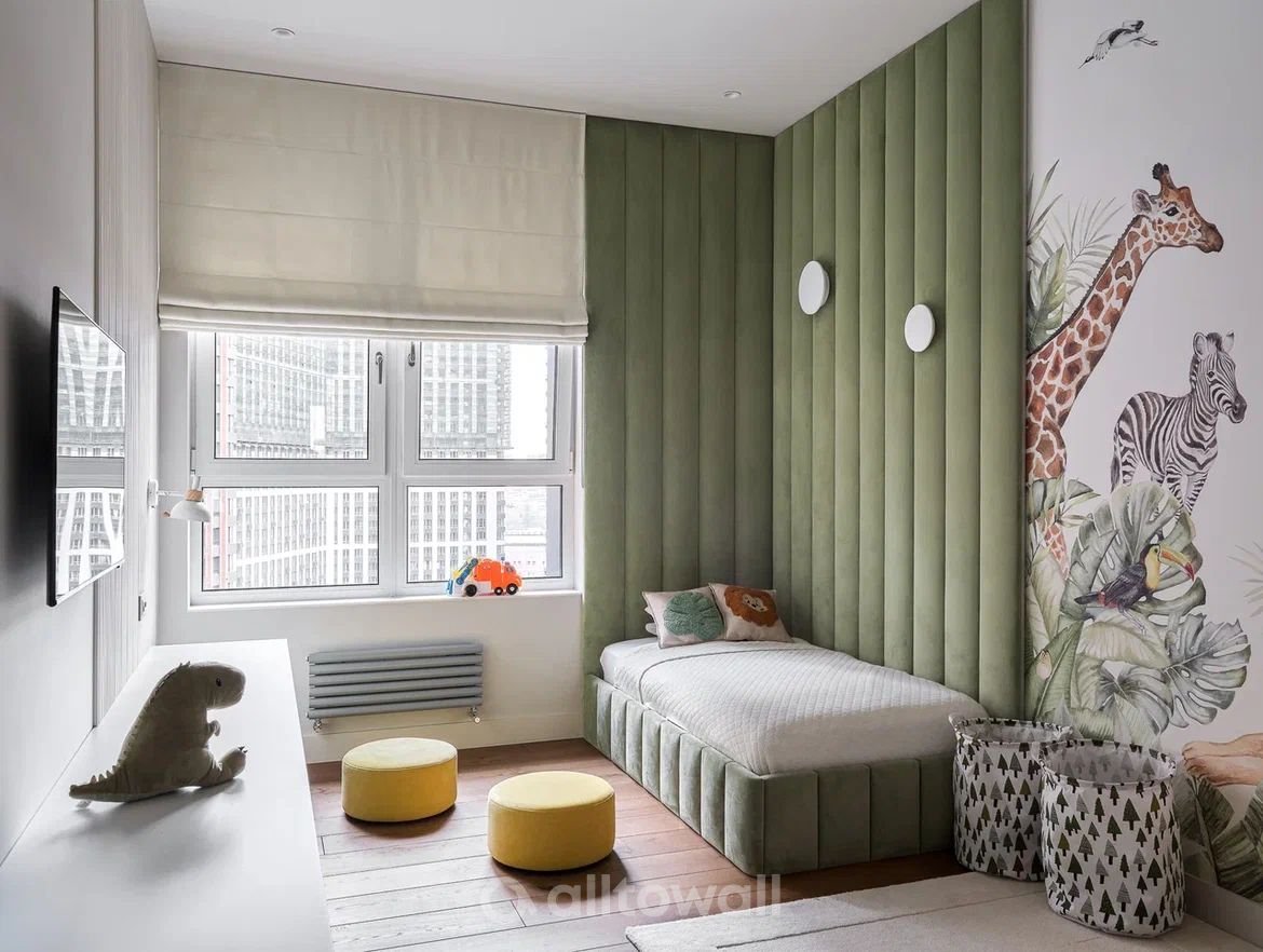 Такой дизайн не перегрузит пространство, и в комнате появится оригинальный акцент, способствующий развитию у ребёнка интереса к животным, природе и путешествиям. Яркие, детализированные обои будут хорошо сочетаться с природными деталями в интерьере — можно добавить плетёные корзины, игрушки в той же тематике: жирафов, слонов, зебр. Так ребёнку будет легко представить, что они будто «сошли с полотна» в игровую и зовут его к приключениям.