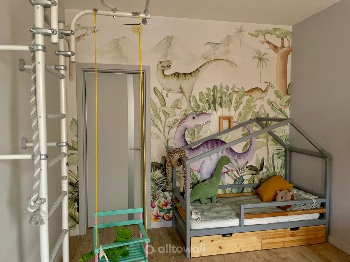 Обои «Эра динозавров» посвящена доисторическому миру и величественным животным, некогда населяющим планету. Студия Alltowall предлагает сказочно красивые обои для малышей младшего возраста, для которых выбрано изображение джунглей и прогуливающихся среди зарослей улыбающихся динозавров. Особая техника рисунка и мягкие, естественные оттенки помогут сделать пространство комнаты для ребёнка наполненным светом и самыми радостными эмоциями.