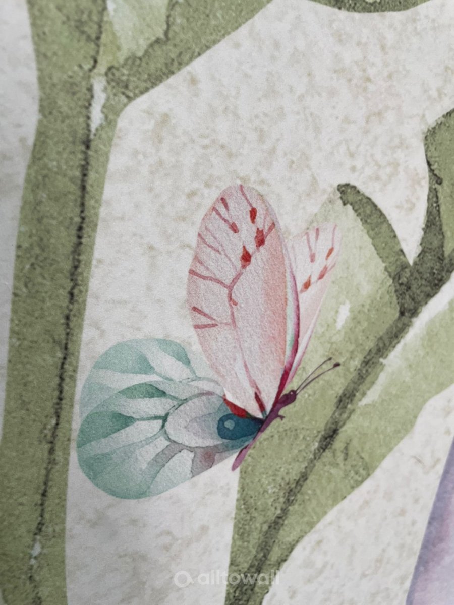 Изображение выполнено в спокойной, естественной гамме. Преобладают бледно-зелёные, бежевые и жёлтые оттенки, сюжет посвящён природе и умиротворяющим пейзажам, тропическим цветам и зарослям, среди которых прогуливаются доисторические животные. Особенности принта визуально расширяет пространство. Изображение растений на светло-бежевом фоне делает обстановку комфортной и уютной. Такие покрытия можно сочетать с однотонными базовыми обоями, формируя гармоничный детский уголок.