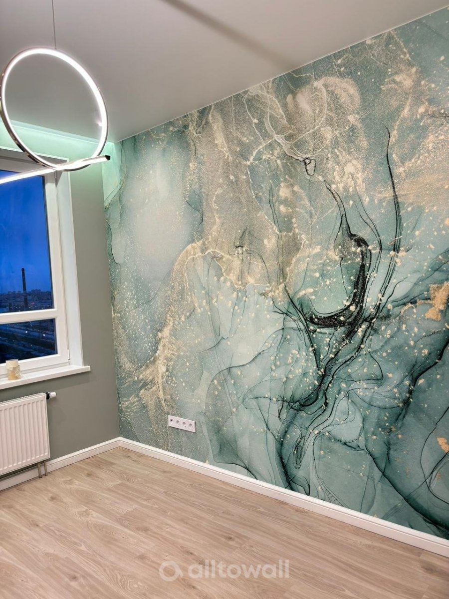 Такие обои, благодаря рисунку под натуральный мрамор и выразительной фактуре с красивой цветовой палитрой, можно сочетать с природными материалами, штукатуркой. Сочетание Тиффани и золота придаёт обстановке больше шика, делает интерьер изысканным и дорогим.