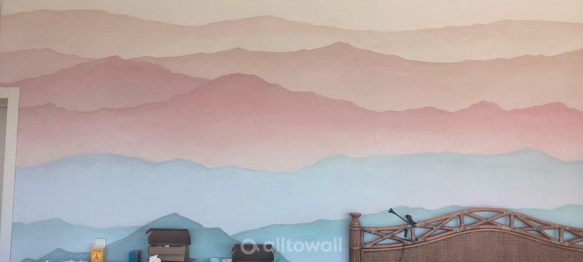 Цветовая гамма спокойная и естественная, с переходами от светлого к тёмному. Задний план с изображением неба в дымке выполнен в очень светлом цвете – розовом и розовато-бежевом. Для горных используется сверху вниз используются оттенки от цвета розового лепестка до голубоватого, зелёного и оливкового. Такое необычное решение успокаивает, делает отдых полноценным.