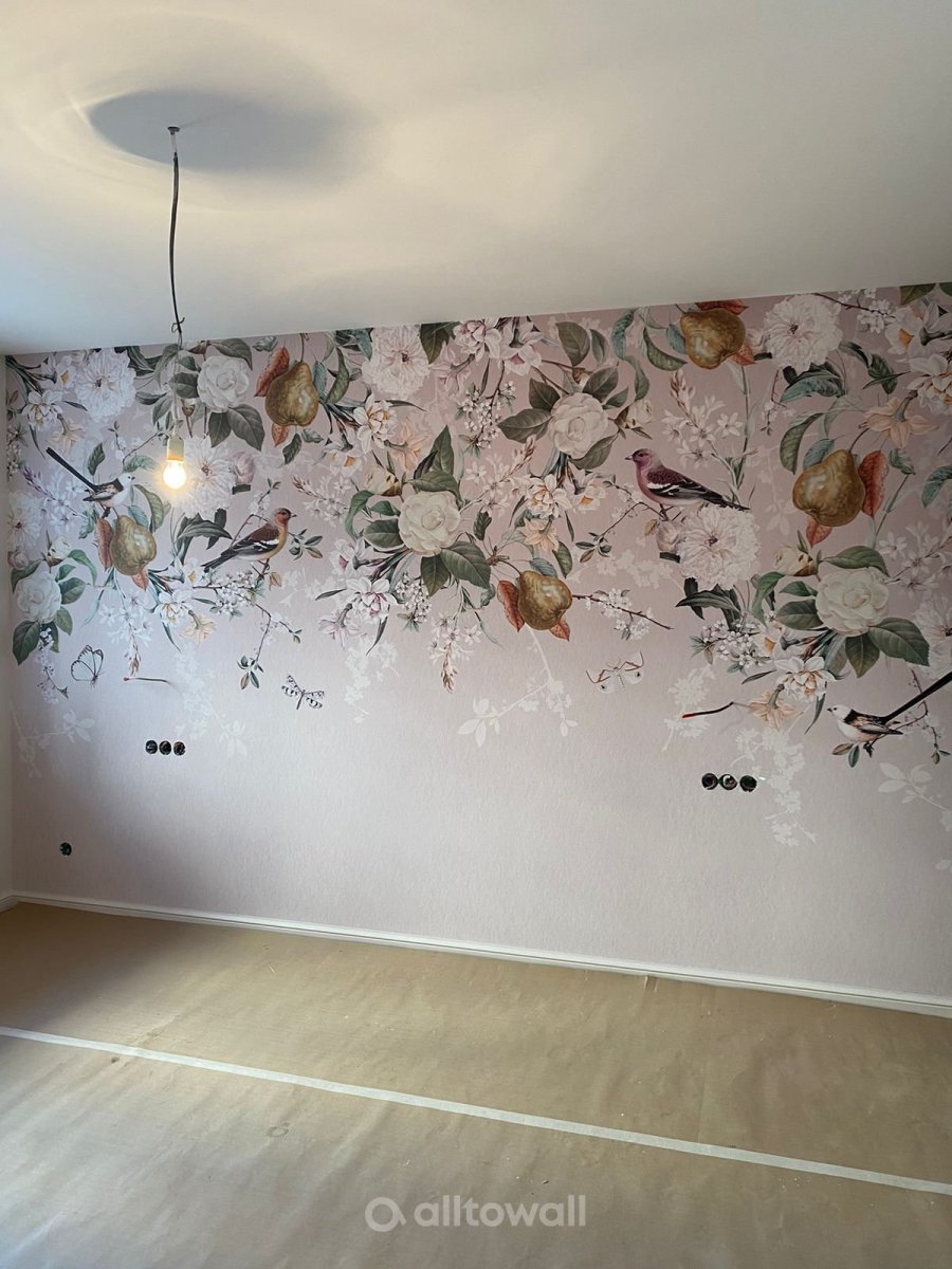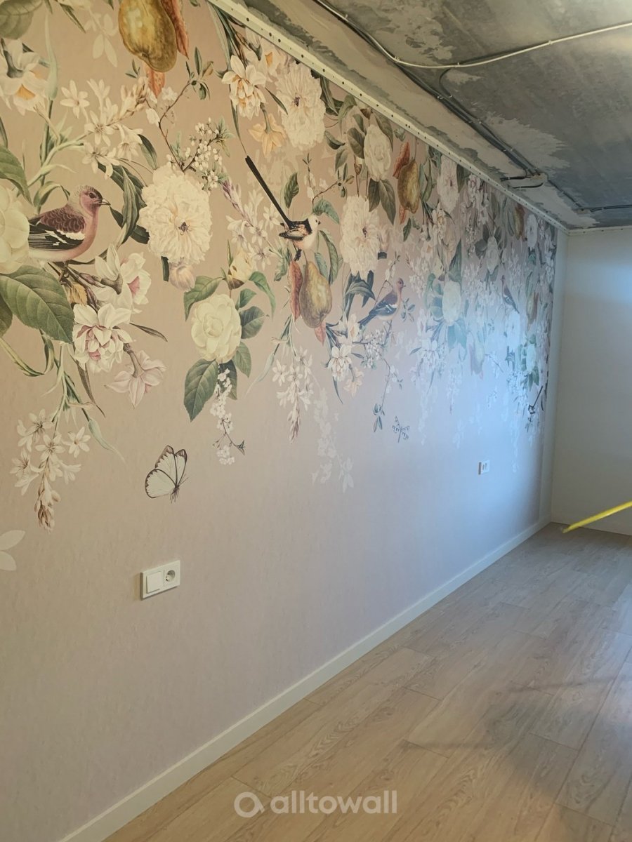 Нежные цветы, спелые груши, изящные бабочки и птицы – такой сюжет прекрасно подходят для элегантной обстановки спальни или уютной гостиной. Интерьер может быть выполнен в классическом стиле, при помощи элементов кантри или Эко. Такое решение станет отличным выбором для комнаты подростка, для романтичной гостиной и уютной спальни.