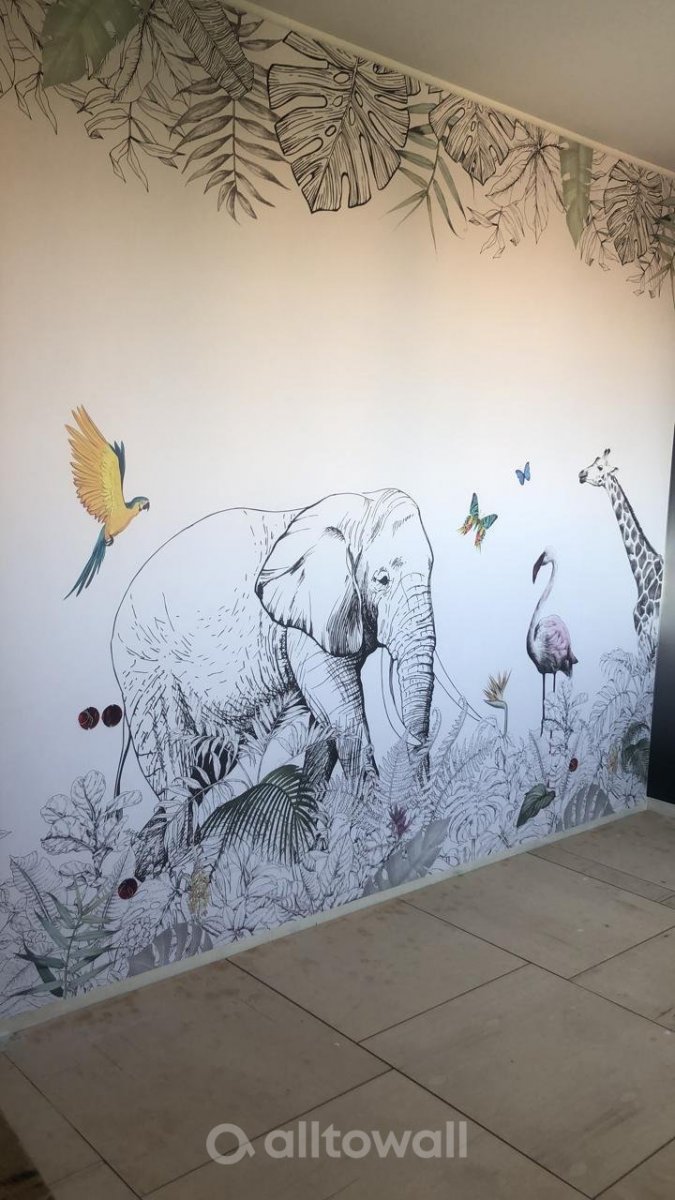 Джунгли – обои из серии, которая посвящена природе африканского континента. Это монохромная модель с изображениями джунглей и местных обитателей. Среди густых зарослей травы и экзотических растений можно увидеть прогуливающихся слона, жирафа, зебру или фламинго. Для рисунка птиц используются яркие краски, которые заставляют обратить на себя внимание, создают необычные акценты на чёрно-белом фоне.