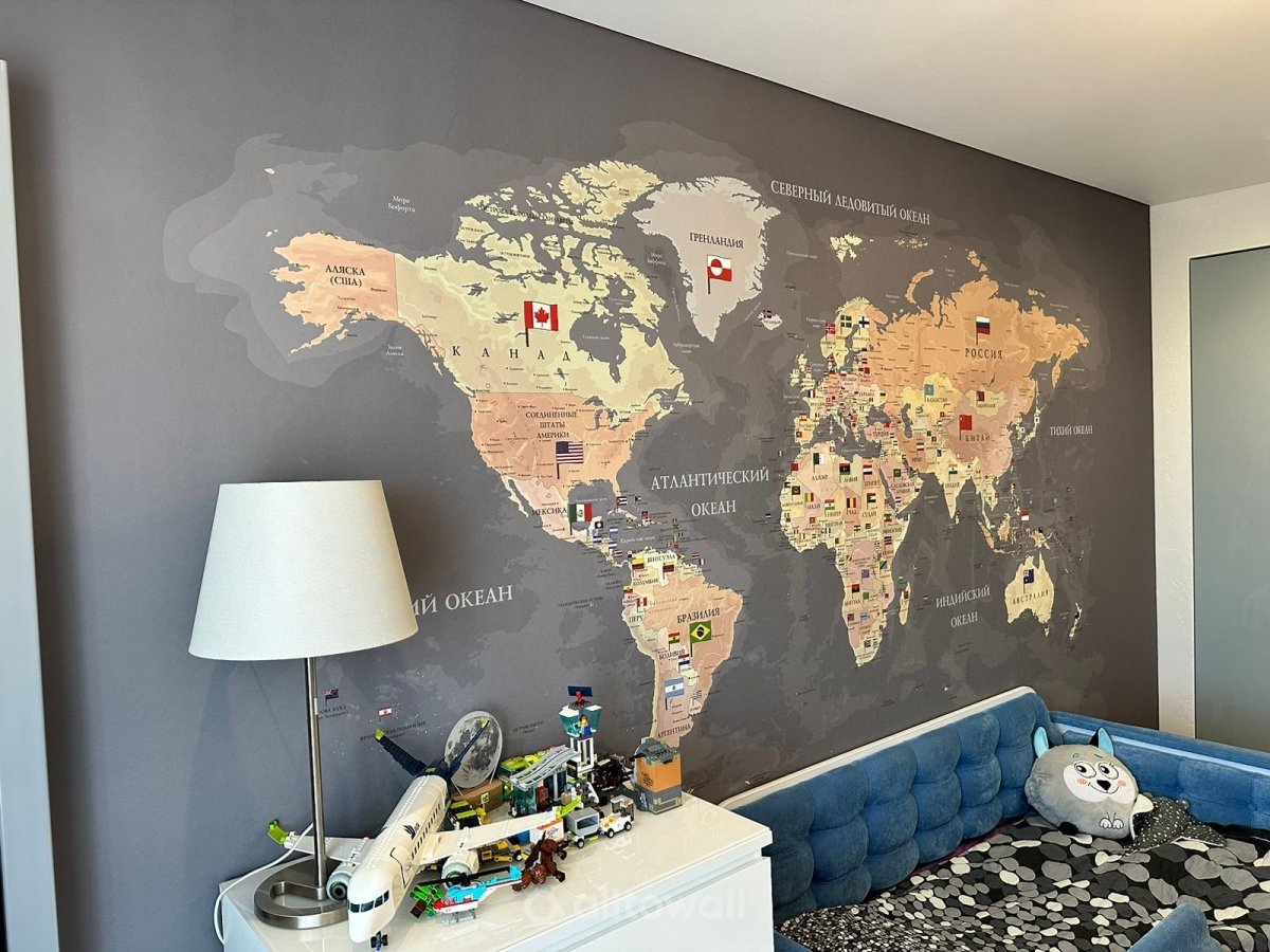 Модель обоев «Карта мира с флагами-2» станет интересным решением для оформления комнаты подростка. Это авторское настенное покрытие, изображающее классическую карту в проекции Меркатора, тёмным фоном для океанов и белыми шапками ледников Антарктиды. На материках видны очертания стран с названиями, для каждого государства изображены национальные флаги.