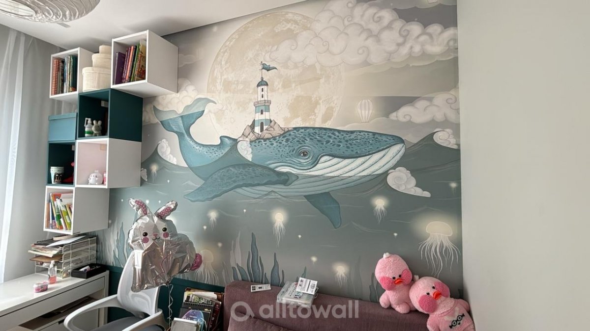 - Создание фокуса или акцента. Рисунок с китом и луной на фоне может стать необычным акцентом при декорировании части стены. Он формирует необходимое впечатление от обстановки.
