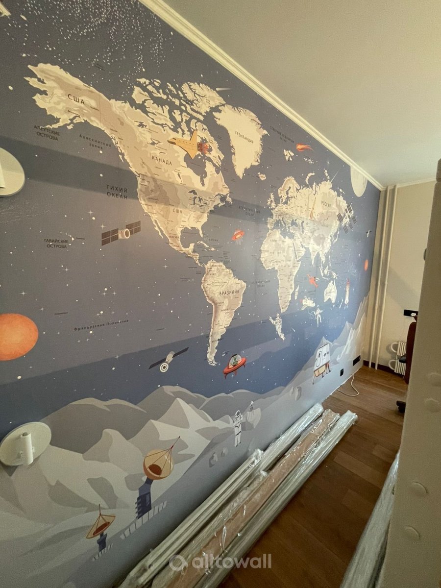 Если вы ищете дизайнерские обои в современном стиле, обратите внимание на сюжет «Космическая карта мира». На голубом фоне изображены космонавты, летательные аппараты и огромная карта с материками и странами. «Космическая карта мира» — это не просто обои, а целая вселенная, которая пробудит у ребёнка интерес к астрономии и географии.