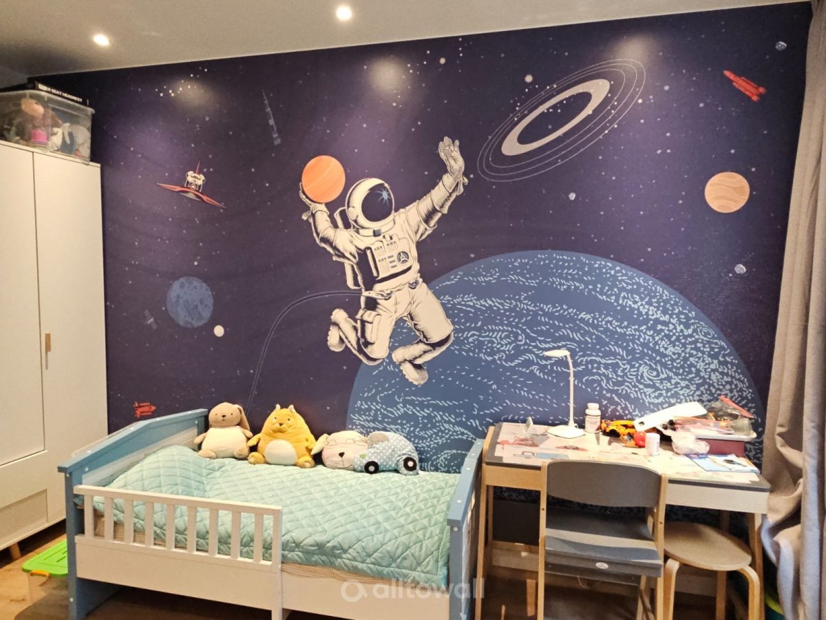 Сюжет представляет собой изображение космического пространства на дальней орбите Земли, где космонавт играет в баскетбол. Необычный рисунок вызывает положительные эмоции, помогает ребёнку в правильном развитии. Такие обои подходят для классической или футуристической обстановки. Основная гамма – естественная – это тёмно-синий, бежевый, белый, бледно-голубой. Использование тёмного фона визуально углубляет пространство, расширяя стены и делая комнату зрительно больше. Центральная фигура притягивает к себе внимание, помогает задать необходимое настроение.