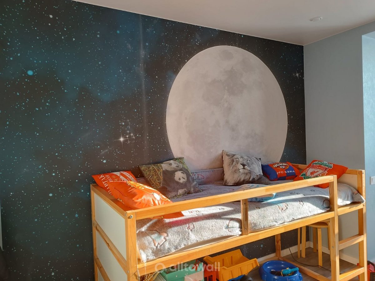 Фон – глубины космоса, в которых мерцают многочисленные звёзды. Небо частично скрыто туманной лёгкой дымкой, что создаёт иллюзию наблюдения с поверхности Земли. Центральный элемент – Яркая, полная Луна, поверхность которой освещена Солнцем. Изображение акцентное, оно притягивает внимание, заставляет вглядываться в глубины космического пространства. Такие покрытия для ребёнка выполняют несколько задача – преображение интерьера комнаты и развитие.