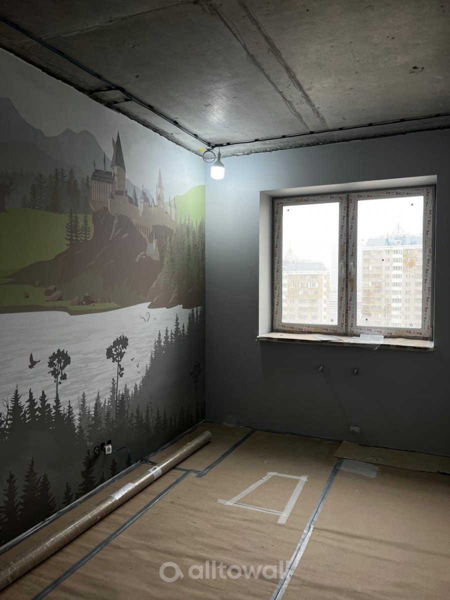 Изображение на обоях выполнено в мягких пастельных оттенках. Это виды на горы, покрытые густыми лесами, среди которых на утёсе выделяется большой замок. Внизу протекает река, в которой видны сказочные животные. Такие обои рекомендуется использовать для акцента или оклеивания только одной стены.