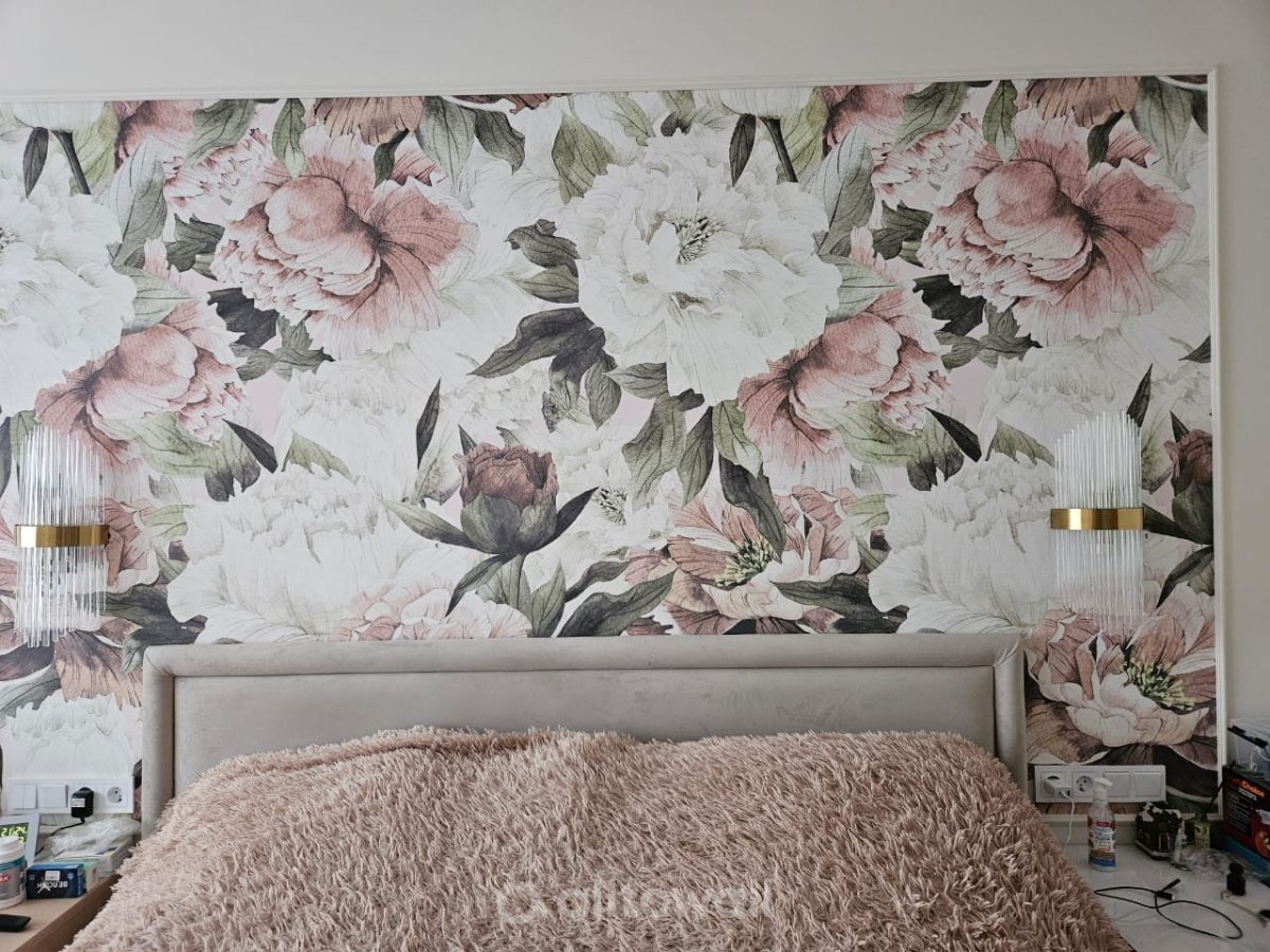 В качестве палитры для покрытия выбраны два доминирующих цвета – розовато-бежевый и белый. Зелёный выступает в качестве акцента, подчёркивая изысканность бутонов. Это светлый фон, который придаёт больше уюта и гармонии обстановке. Он подходит для большой или малой площади спальни, красиво смотрится при естественном и искусственном освещении. Бутоны выполнены в особой технике с чётко прорисованными контурами и прожилками на лепестках, что обеспечивает объёмный эффект. Листва вокруг красиво обрамляем цветы, формируя замысловатый рисунок, притягивающий к себе