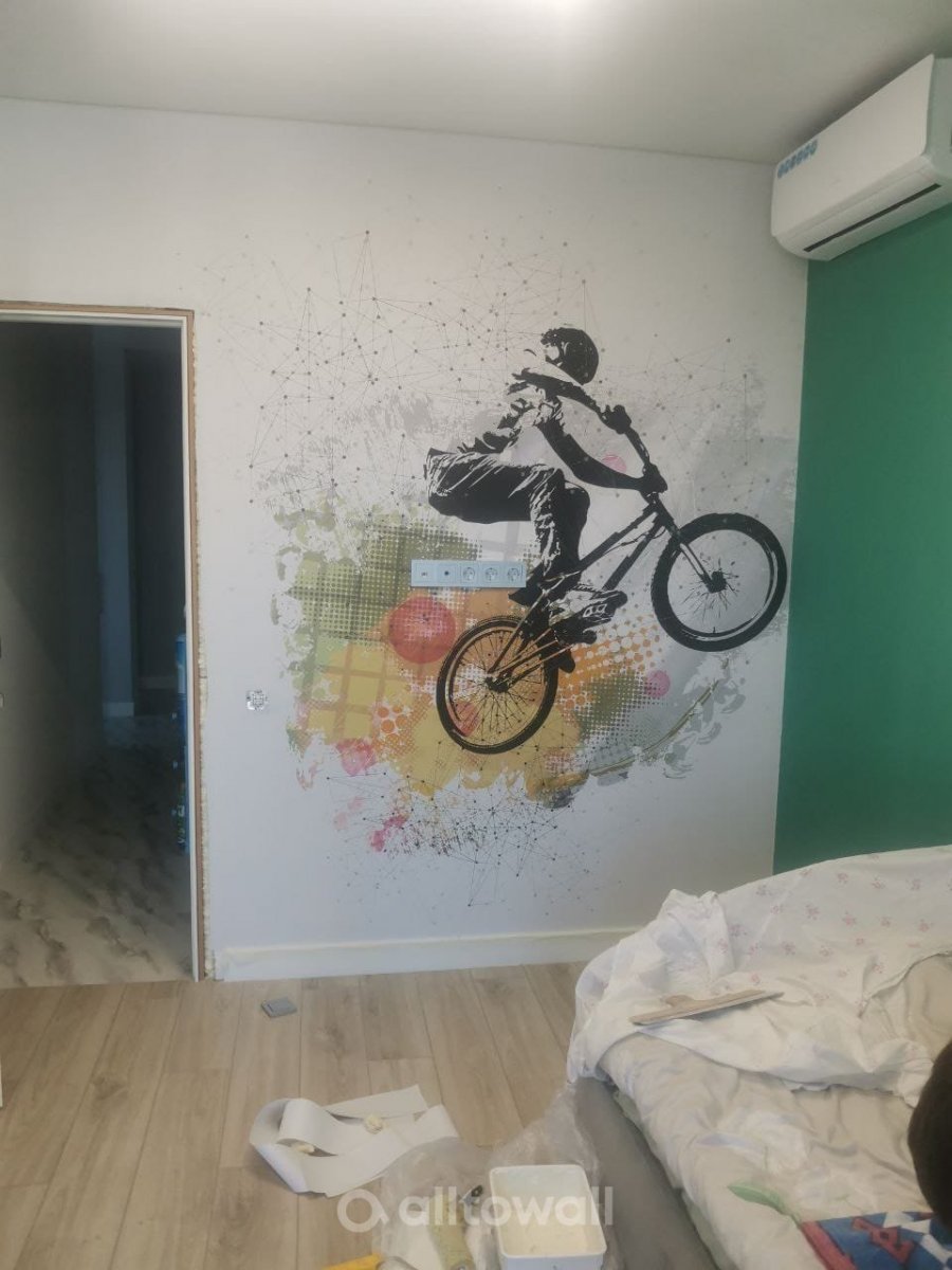 - Для оклеивания акцентной стены, которая станет определяющей для интерьера. Рисунок с BMX-райдером в центре контрастный, выделяющийся на фоне обстановки. Для окружающих стен рекомендуется использовать белый цвет, что визуально раздвинет пространство, сделает помещение светлее.