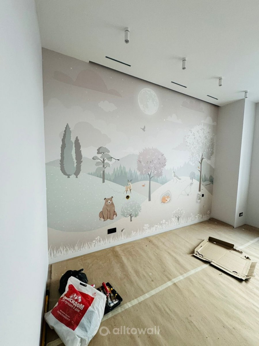 Модель обоев «На поляне-2» специально разработана для комнаты ребёнка от 2-х лет и старше. Это изображение в стиле книжной иллюстрации, истории о жизни летнего леса и его обитателей. Среди деревьев и на полянах можно увидеть отдыхающую лисичку и зайцев, величественного медведя и оленя. В небесах парят птицы, на холме выводит свою песню волчонок.