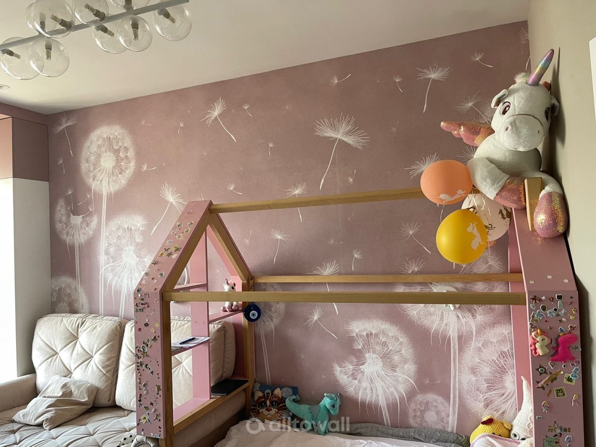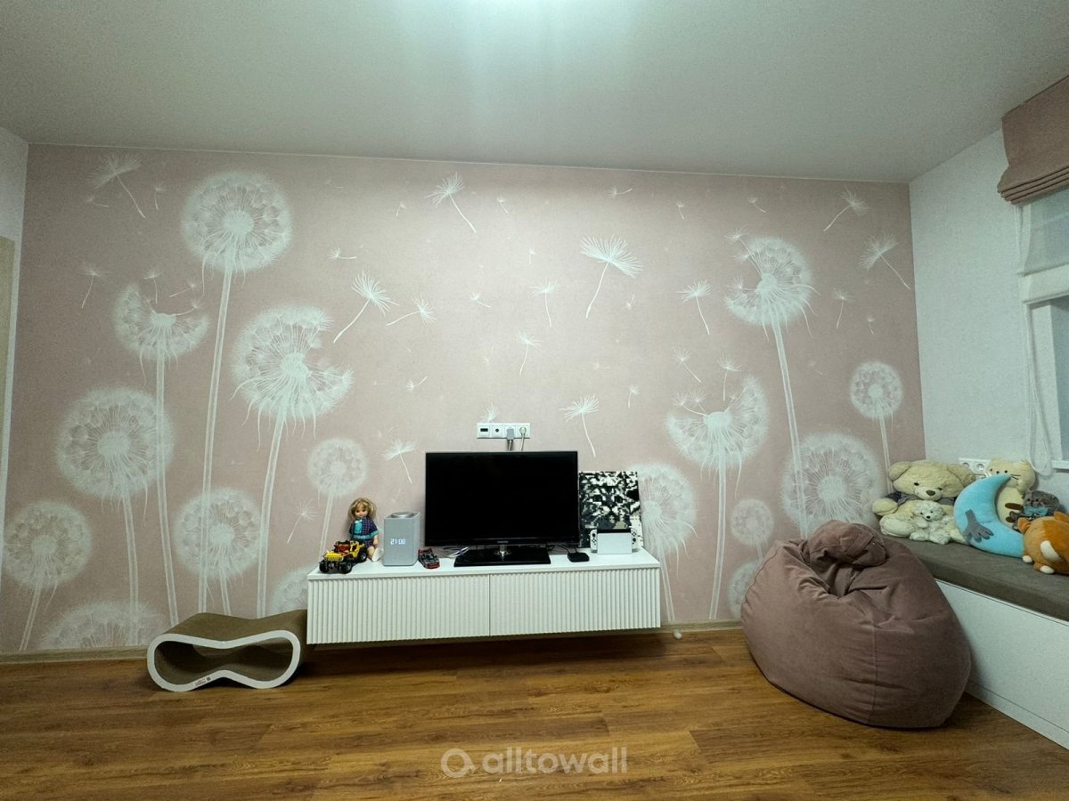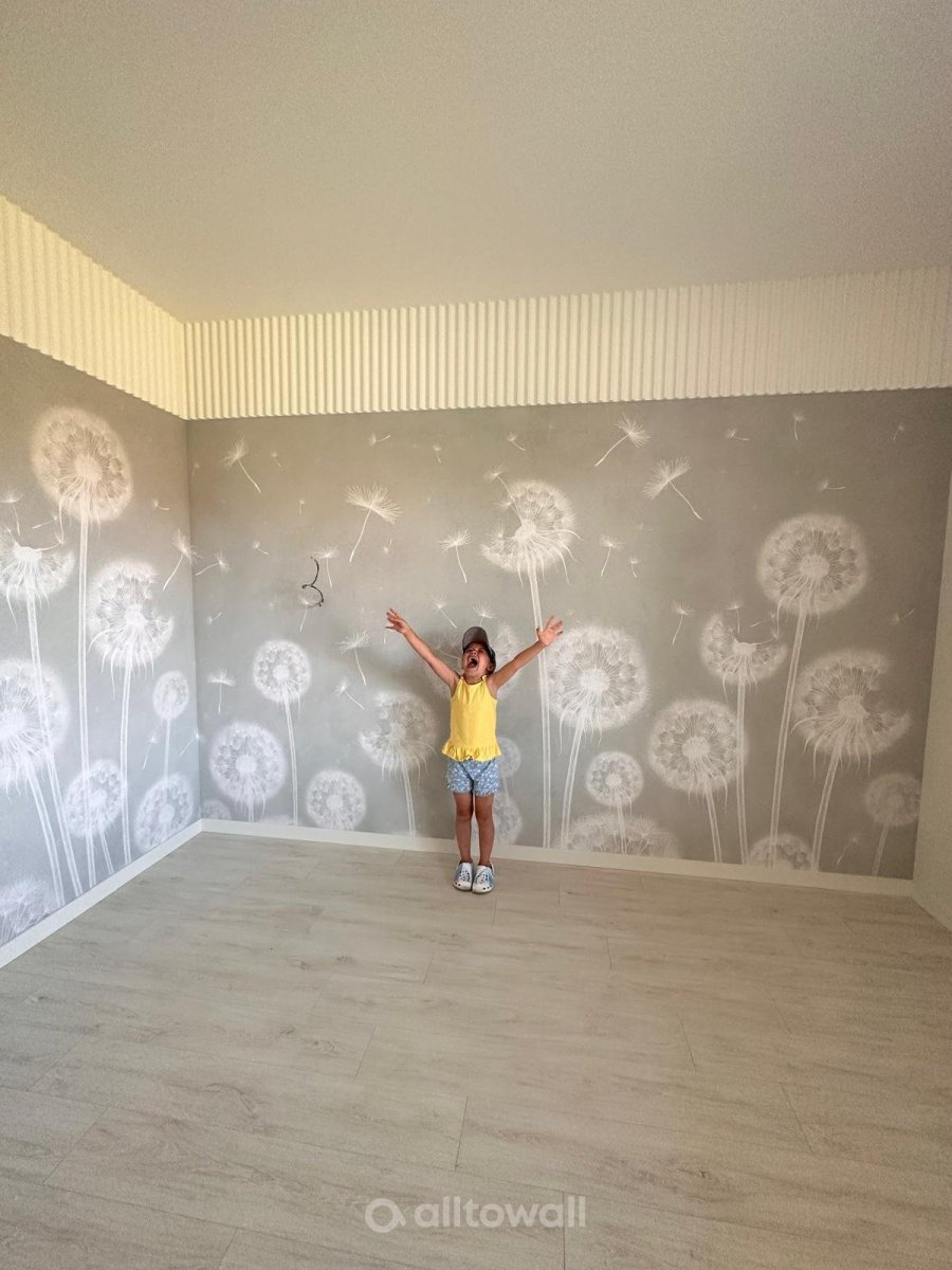 Обои с одуванчиками могут стать основой для оформления акцентной стены в детской или гостиной. Они создадут законченное оформление комнаты для погружения в тему природы. Рисунок крупный, но за счёт мягкости оттенков и воздушности подойдёт для оформления как одной, так и всех стен в комнате.