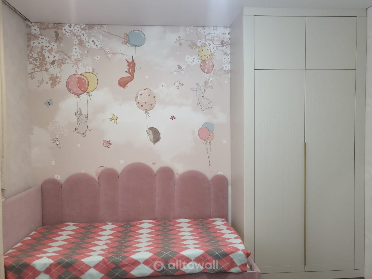 На воздушных шариках – модель детских обоев, разработанная для малышей с первых дней жизни. Это спокойный сюжет, изображающий весёлых зверят, которые парят среди облаков на фоне закатного неба и ветвей цветущей вишни. Малыши могут увидеть игривых лисичек, ёжиков, зайчат, которые вместе радуются весне, летая на воздушных шариках среди птиц и бабочек.