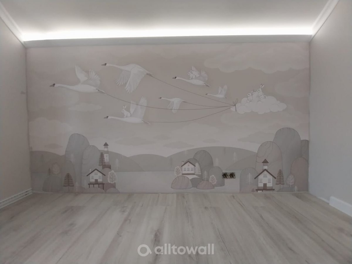 Студия Alltowall предлагает серию настенных покрытий, посвящённых природе и птицам. «Озёрный край» специально разработан для детской комнаты малышей, формирования гармоничной обстановки для полноценного отдыха. Для это модели выбрана пастельная палитра – белые, бежевые, светло-коричневые оттенки. Они отлично гармонируют с натуральными материалами в отделке помещения, светлой мебелью.