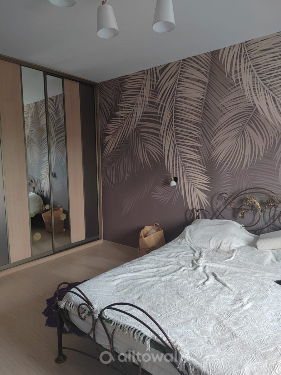 Изображение посвящено тропической природе – большим и раскидистым листьям высоких пальм, раскинувшихся под солнцем. Рисунок отличается тем, что его нижняя часть свободная от любых деталей, принт листьев сосредоточен в верхней и средней части полотна. Кажется, что ветви нависают над головой, визуально поднимая высоту потолка и делая помещение просторным.