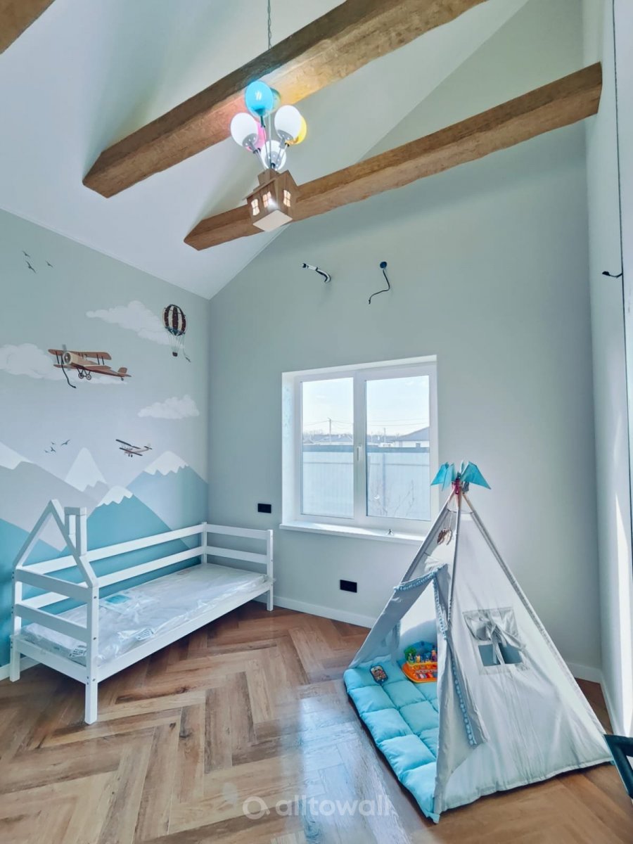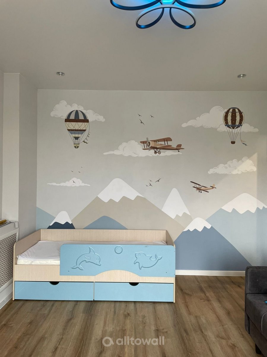 О чём дети мечтают с раннего детства? Конечно о веселье, играх и небе — голубом и бескрайнем. Не зря многие малыши так любят самолёты. Но для того, чтобы почувствовать парение в окружении первозданной природы, не обязательно ехать в аэропорт, воссоздать ощущение полёта помогут обои «Скандинавские горы». На них кроме заснеженных вершин изображены необычные и красивые бипланы с двойным крылом. Зрительный ряд вместе со светлыми тонами создают в детской комнате лёгкую атмосферу, визуально расширяют пространство.