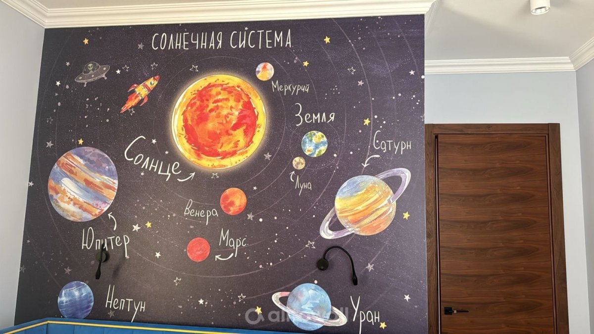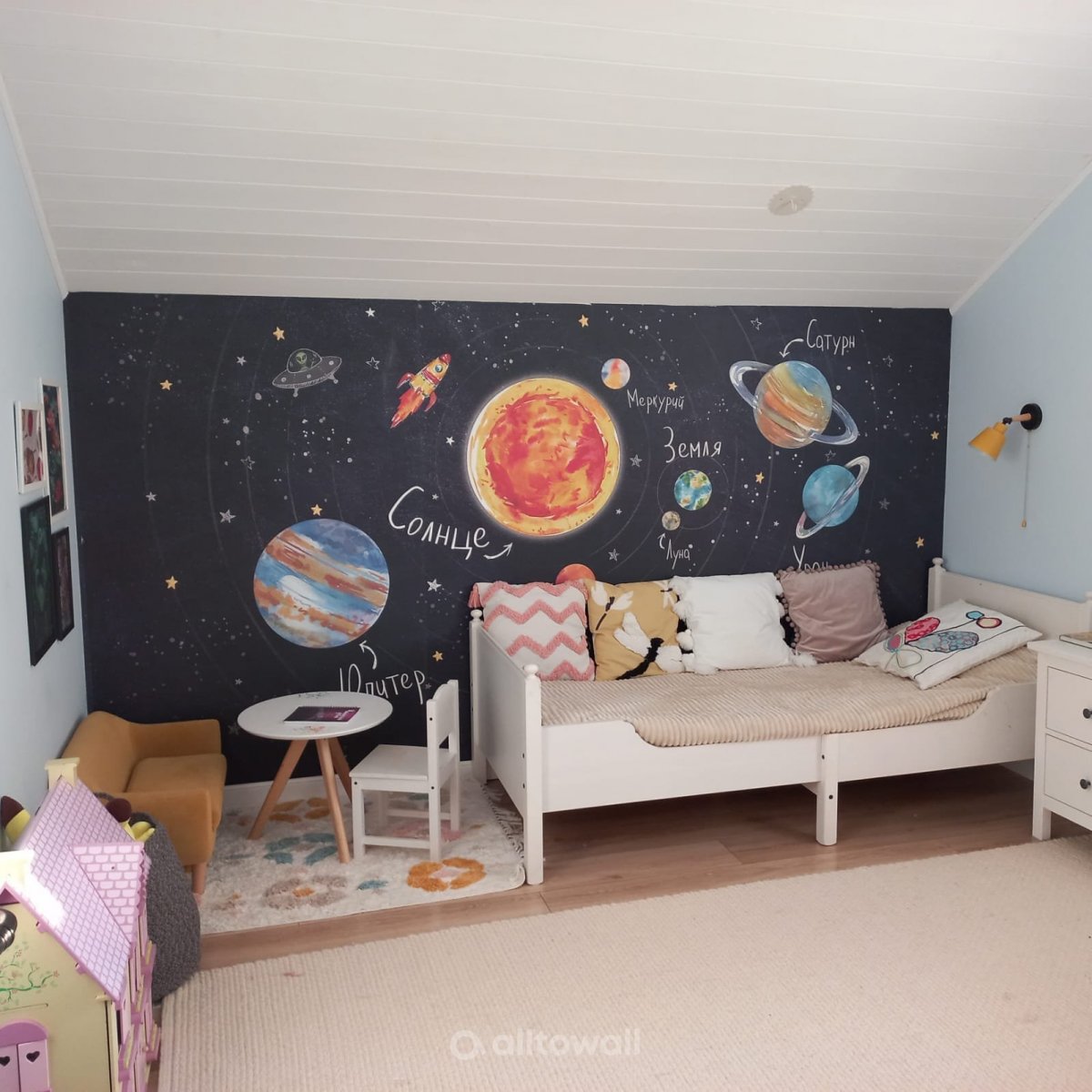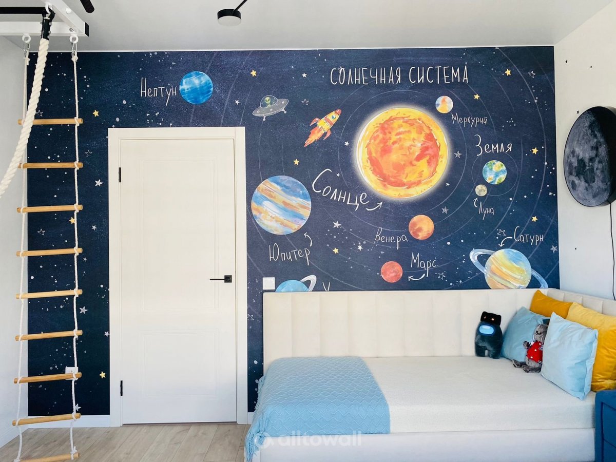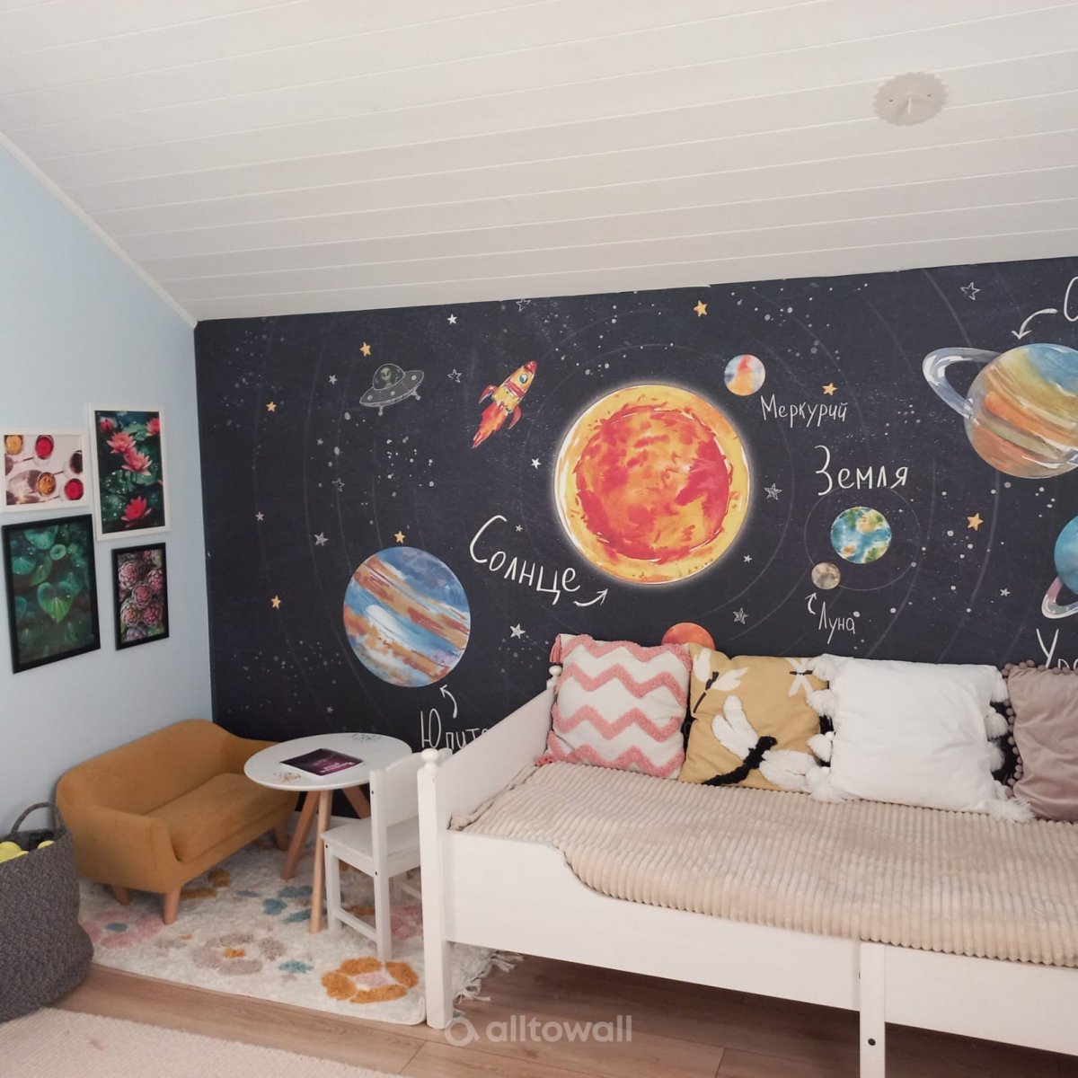 Рисунок выполнен в стиле книжной иллюстрации с насыщенными и яркими цветами. Преобладают тёмно-синий, жёлтый, зелёно-голубой, оранжевый, лиловый цвета. Такие покрытия станут отличным вариантом для игровой или спальни ребёнка, который мечтает о космосе и путешествиях по вселенной. Но также материалы помогут с обучении – малыш получает возможность выучить названия планет, которые нанесены на обои с имитацией мелового рисунка.