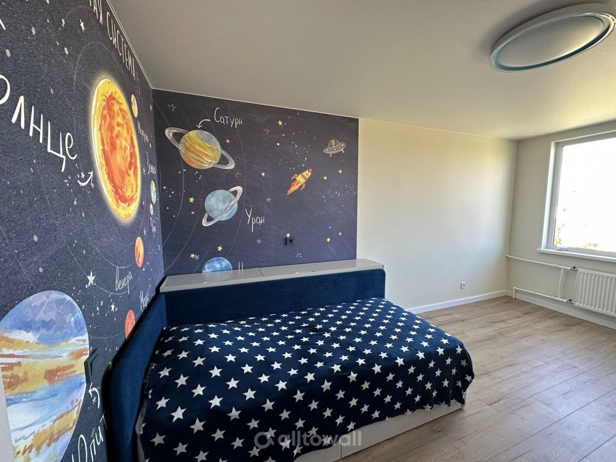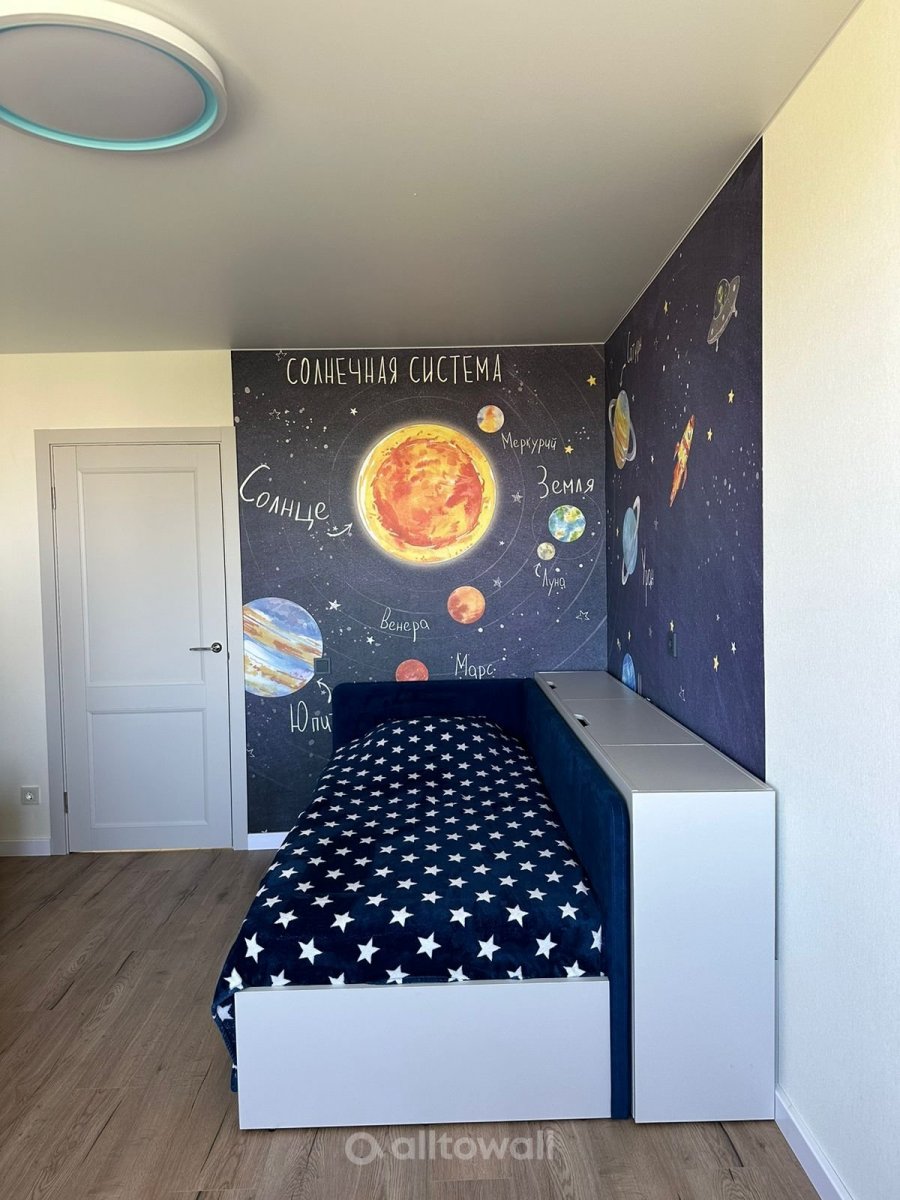 - комбинирование с применением рисунка, посвящённого космосу, в сочетании с однотонными материалами, обоями с принтом оклеивается только одна плоскость;