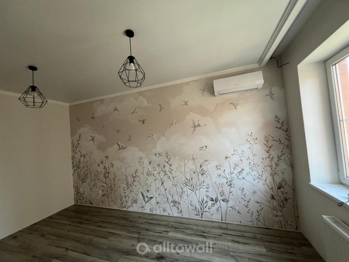 Принт посвящён танцу ласточек, которые парят среди облаков в летнем небе. Такое решение визуально делает пространство больше, создавая иллюзию раздвижения границ комнаты. Нижняя часть полотна – это изображение трав и ягодных кустарников, которые словно колышутся под дуновением лёгкого летнего ветерка.