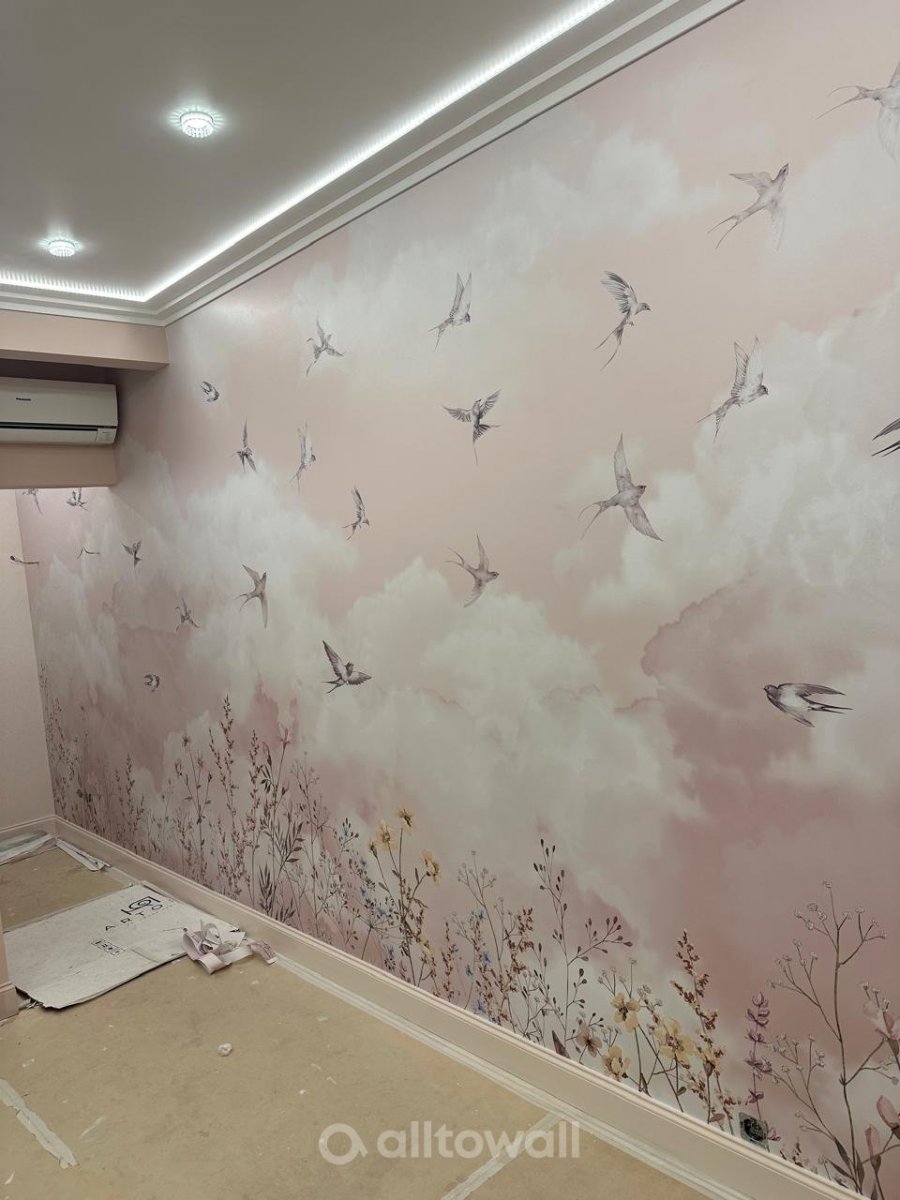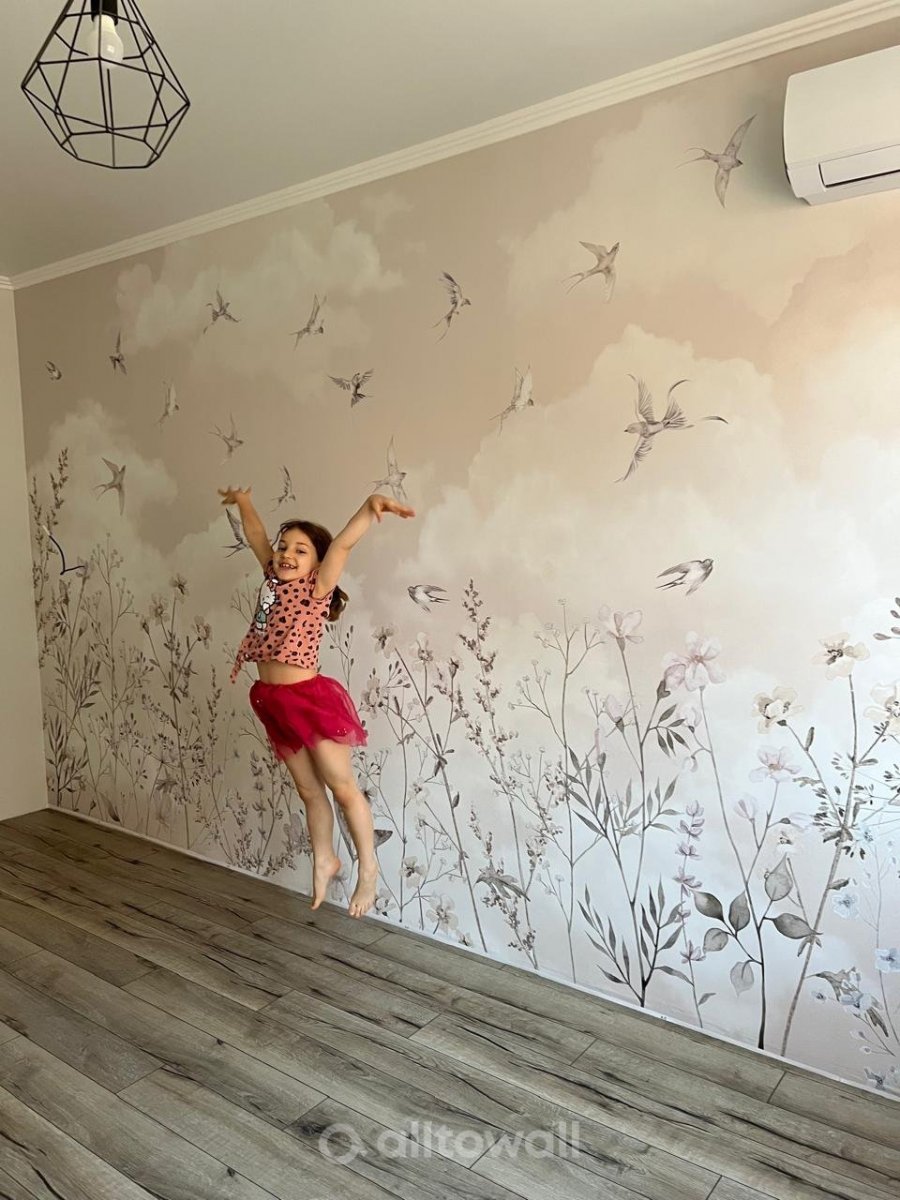 - сюжет специально разработан для спален девочек различного возраста, парящие ласточки настраивают на полноценный отдых, а мягкие пудровые оттенки успокаивают;