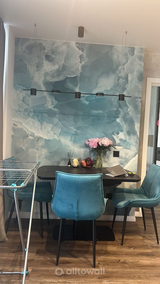 Обои представляют собой имитацию натурального мрамора со слоистым рисунком и характерными переходами цвета. Основа обоев – бело-голубая с тонкими прожилками и вставками синего, имитирующими срез драгоценного мрамора. Это визуально придаёт изображению эффект глубины, создаёт иллюзию полупрозрачной каменной панели.