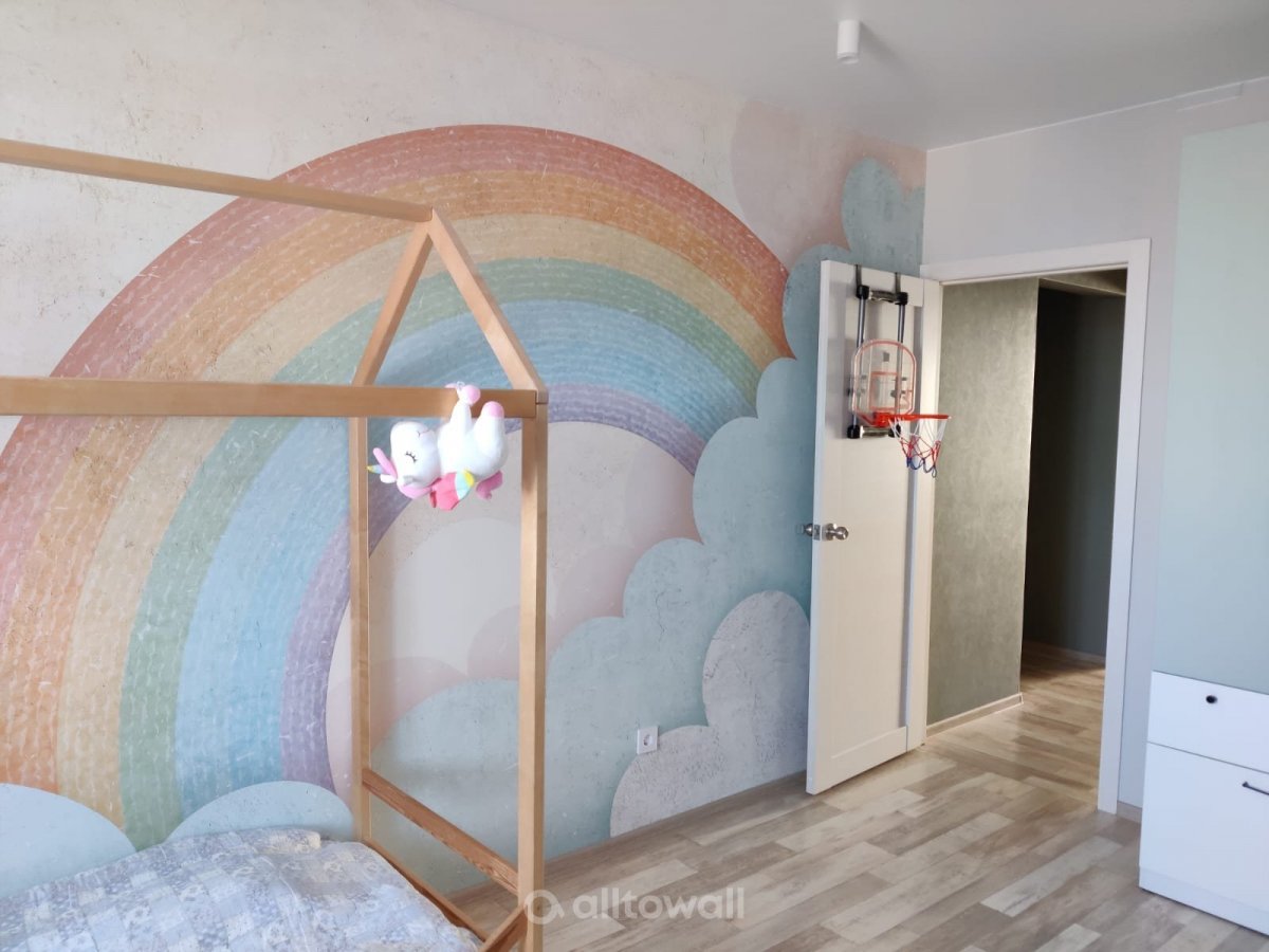 Такая модель обоев подходит для декорирования комнаты маленького ребёнка. Она создаёт имитацию спальни на облаках, посреди розовеющего неба и радуги после лёгкого летнего дождя. Применение пастельных оттенков, фактуры и рельефной основы полотна визуально обеспечивает перспективу. Для поверхности используется специально состаренный слой, который на внешний вид напоминает фреску.
