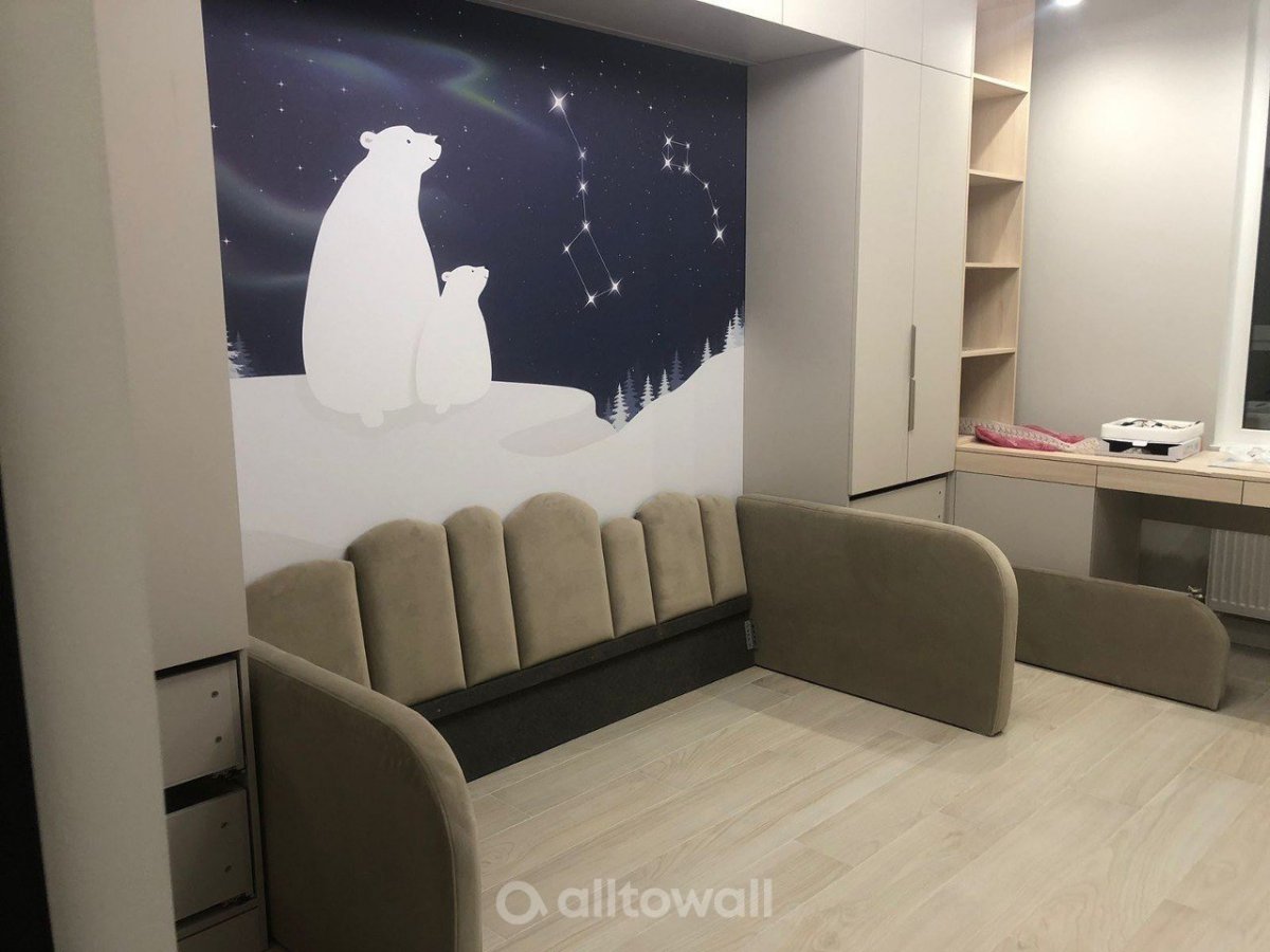 Большая медведица – обои, посвящённые сказочной арктической ночи. Это красивый и умиротворяющий заснеженный пейзаж с виднеющимся вдали лесом. На переднем плане видна семейка белых медведей – мама с медвежонком, которые любуются сверкающими в небе звёздами, полярным сиянием и двумя главными созвездиями – Большой и Малой Медведицы. Рядом с медведями виден вход в нору и второй медвежонок. Цветовая гамма спокойная, выполнена в холодных оттенках. Преобладают белый, синий, льдисто-голубой цвета. несмотря на тёмный, фон, такие покрытия подходят для помещений с окнами, выходящими на любую сторону света.