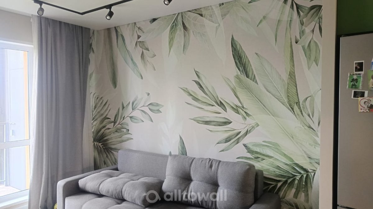 - сюжет с тропиками и природными сюжетами относится к универсальным, прекрасно смотрится для комнат с нехваткой площади или при необходимости акцентного оклеивания стены.